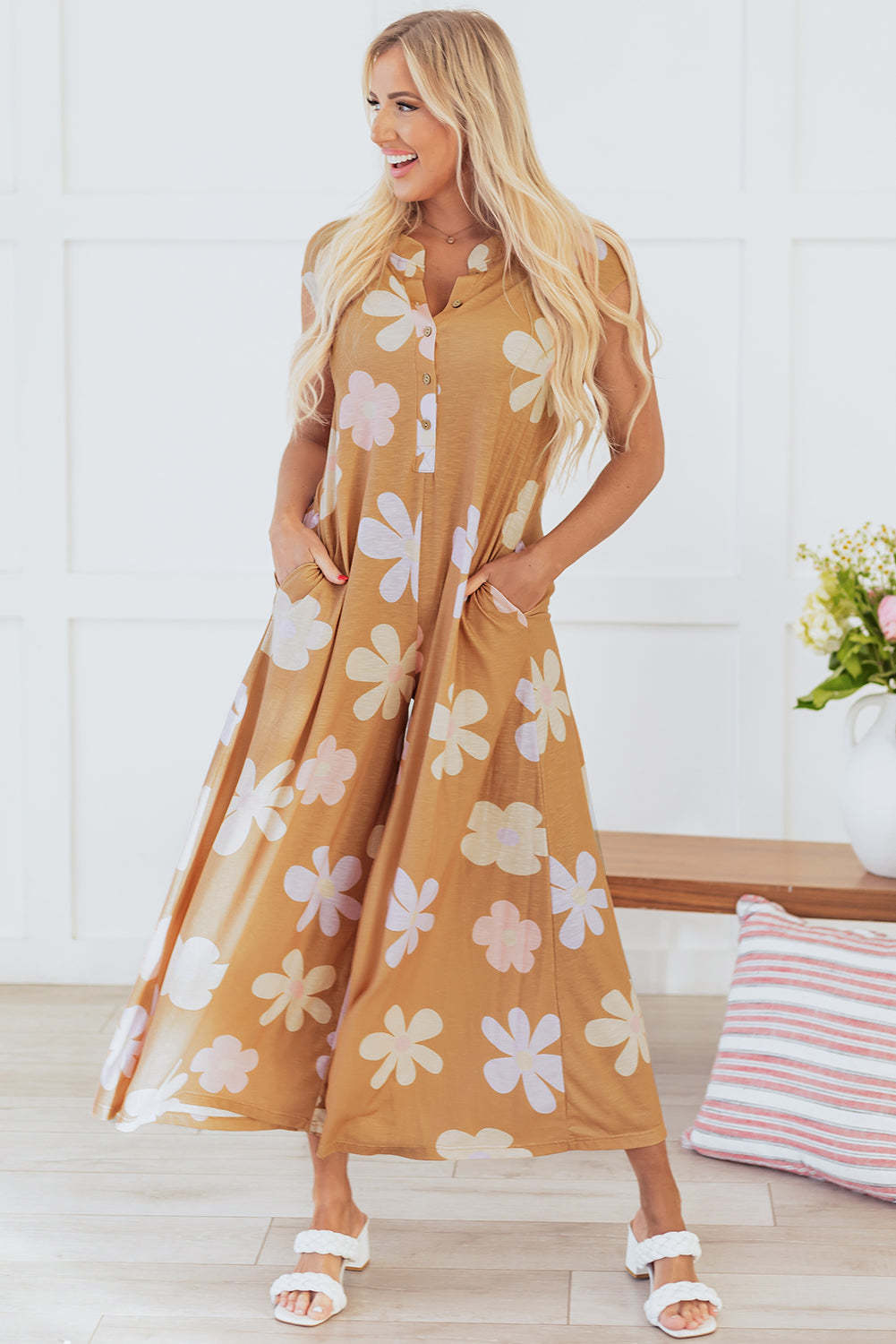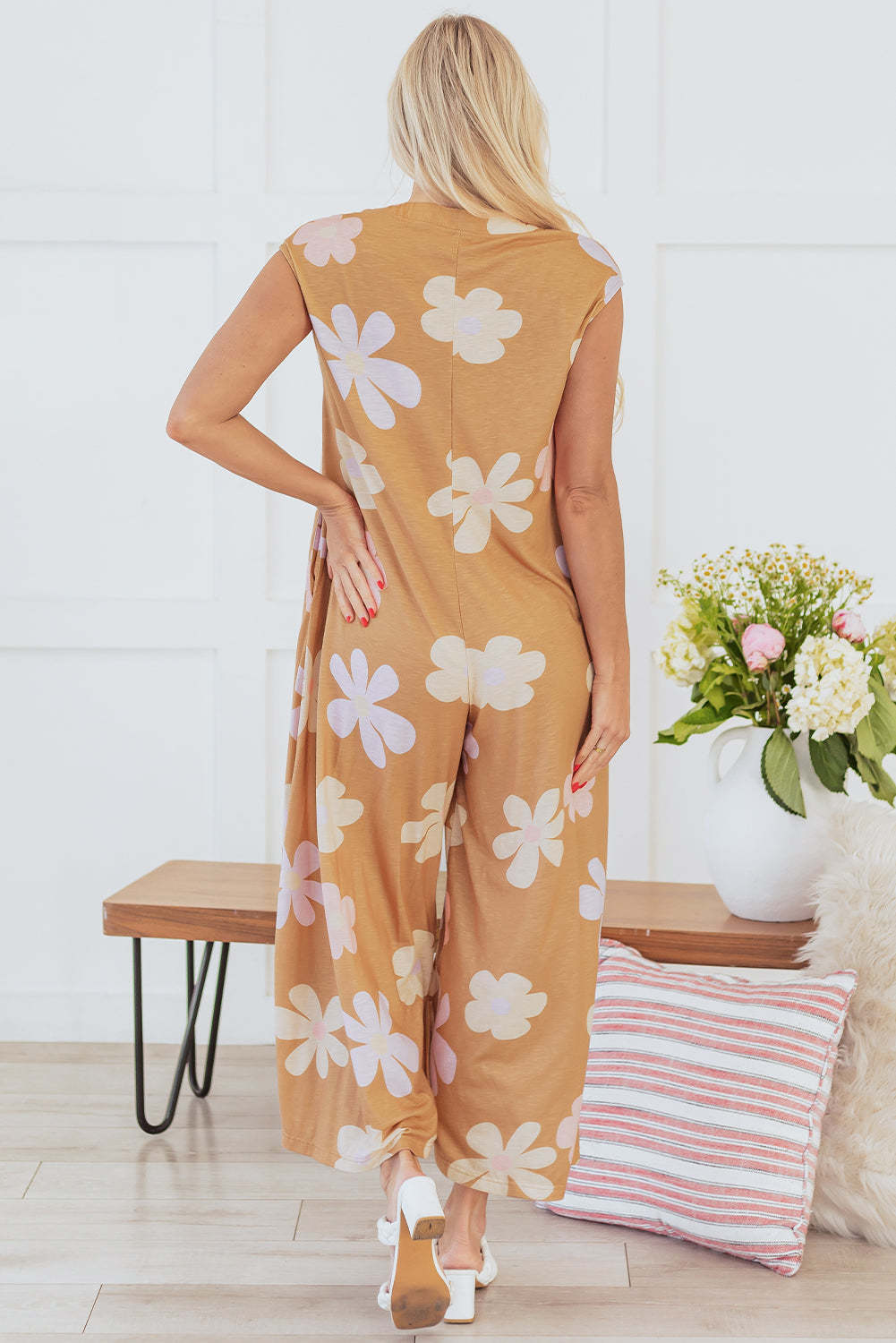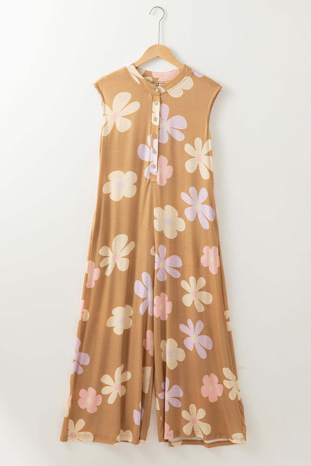Be cool and comfy in this sleeveless jumpsuit! Its breezy design and classic button-up front will elevate any outfit. Plus, the vibrant floral print adds a pop of color and a playful twist. (FYI: The waist belt in the picture is not included.)