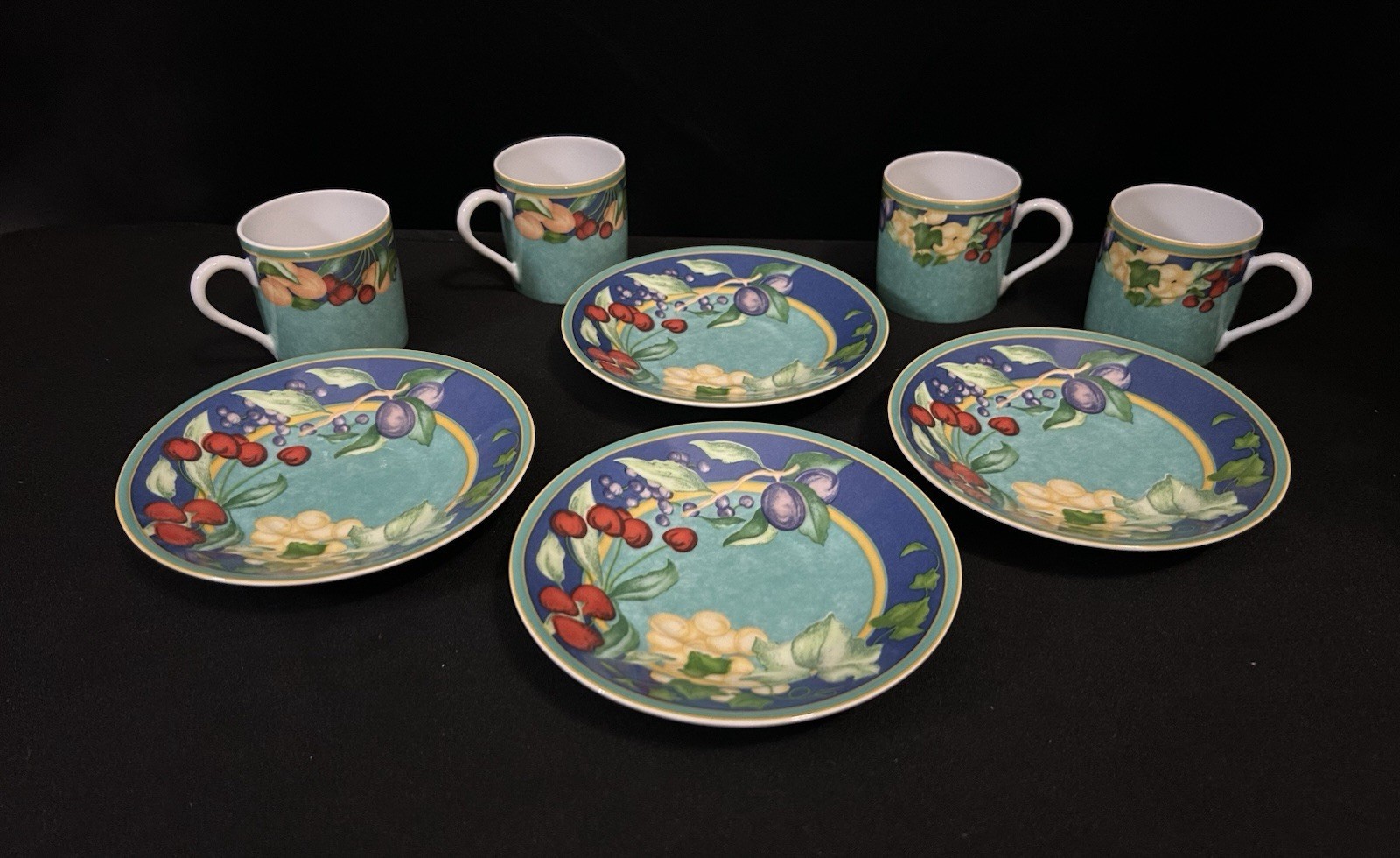 Beautiful 8-piece set of Laure Japy Paris - Gourmandise design teacups and saucers. Cups are 2.25? and saucers are 5?.