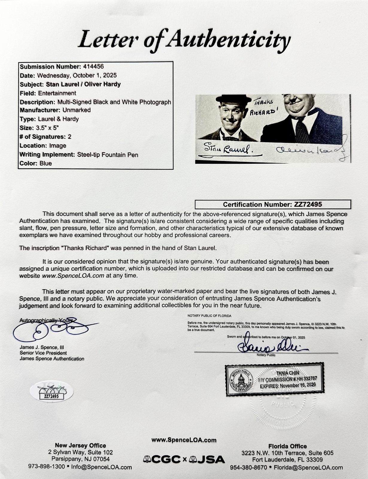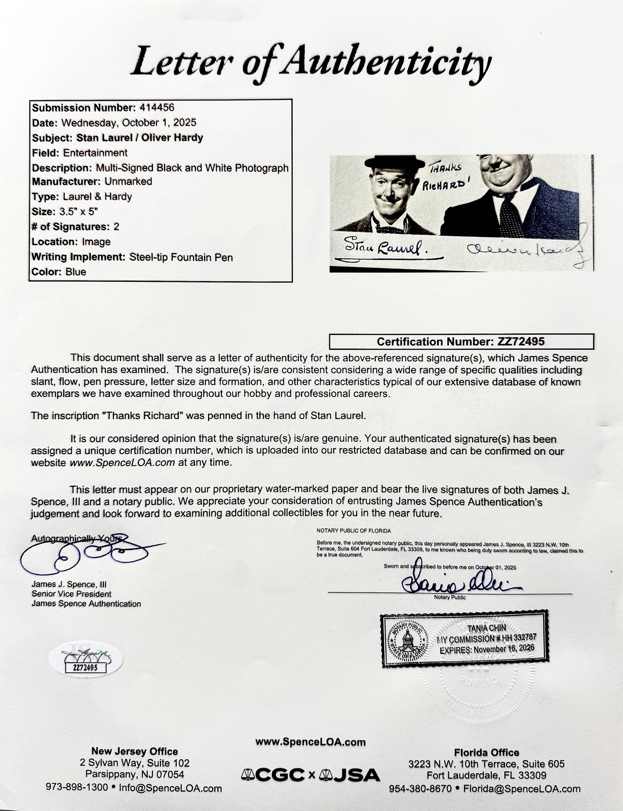 Laurel and Hardy autographed 3 1/2" x 5" photo signed in blue steel - tip fountain pen by Stan Laurel and Oliver Hardy and inscribed Thanks Richard in the hand of Stan Laurel. These are about as bold of signatures you are going to see with the photo having sharp corners unlike most of these photos. These signatures have been authenticated by JSA James Spence authentication Certification Number: ZZ72495 and will come with the Letter of Authenticity you see in the scans. Laurel and Hardy were a British - American comedy team during the early Classical Hollywood era of American cinema, consisting of Englishman Stan Laurel (1890 -1965) and American Oliver Hardy (1892-1957). Starting their career as a duo in the silent film era, they later successfully transitioned to "talkies". From the late 1920s to the mid-1950s, they were internationally famous for their slapstick comedy, with Laurel playing the clumsy, childlike friend to Hardy's pompous bully. Their signature theme song, known as "The Cuckoo Dong", "KuKu", or "The Dance of the Cuckoos" (by Hollywood composer T. Marvin Hatley) was heard over their films' opening credits, and became as emblematic of them as their bowler hats. They appeared as a team in 107 films, starring in 32 short silent films, 40 short sound films, and 23 full-length feature films. In 2005, they were voted the seventh-greatest comedy act of all time by a UK poll of professional comedians. Charlie Kunz (August 18,1896 - March 16,1958) signed the backside of the page. He was an American born pianist and band leader who worked in Great Britain during the British dance band era, eventually becoming a well-known solo pianist. Buy with confidence we have been selling autographs since 1992.