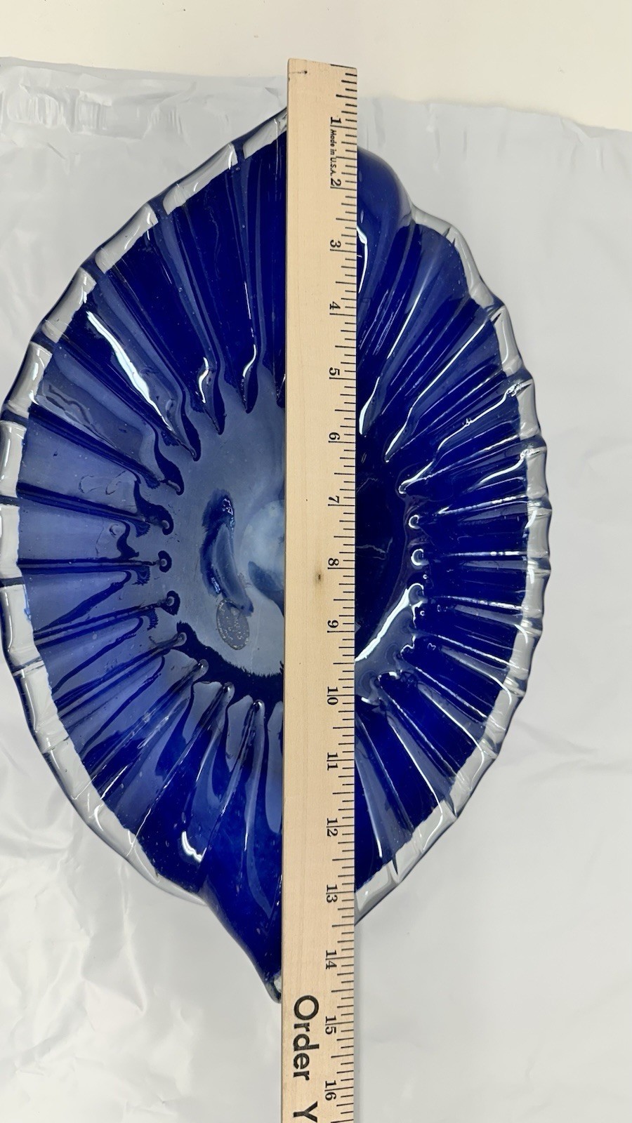 Add a touch of vintage charm to any room with this stunning Lavorazione Arte Murano Italy cobalt blue encased art glass ruffle bowl. Handmade and hand-blown, this unique piece features a beautiful ruffled pattern and a stunning blue and clear iridescent color combination. Measuring 13 inches in length, 9 inches in width, and 3 inches in height, this original mid-century modern bowl is perfect for any occasion.
