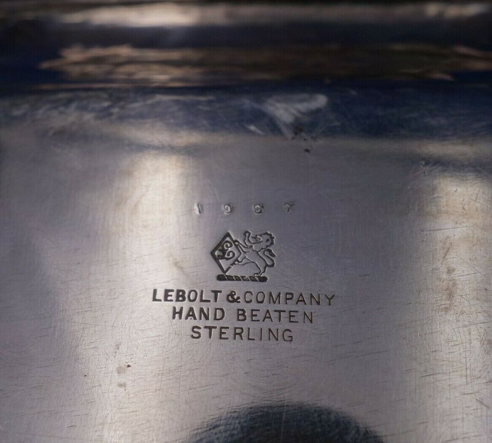 Gorgeous Lebolt sterling silver hand beaten tea tray marked #1987. This piece measures 23" (actual size) x 17" and weighs 86.3 troy ounces. It is not monogrammed and is in good vintage condition. Remarkable!