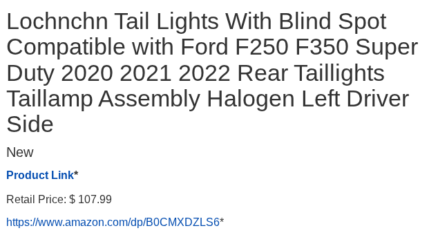 - Left Side Tail Light Assembly For Ford F-250 Super Duty 6.2L 20-22 Red Housing