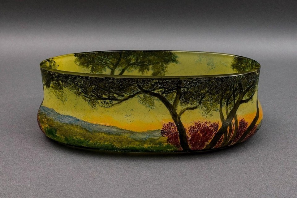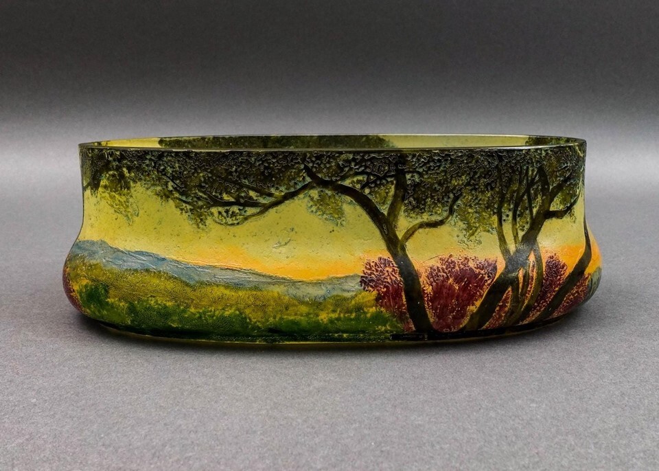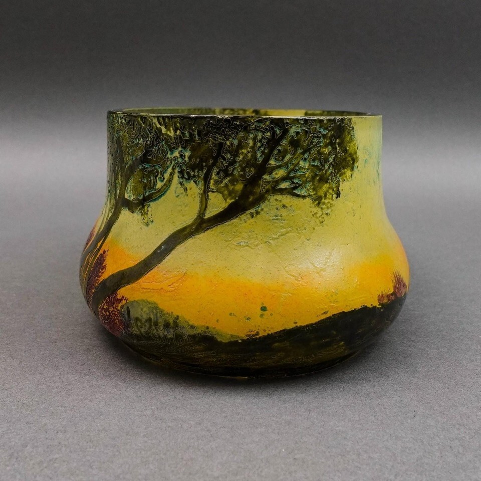 Legras France Signed Scenic Landscape Enamel Cameo Glass Jardiniere Bowl Vase