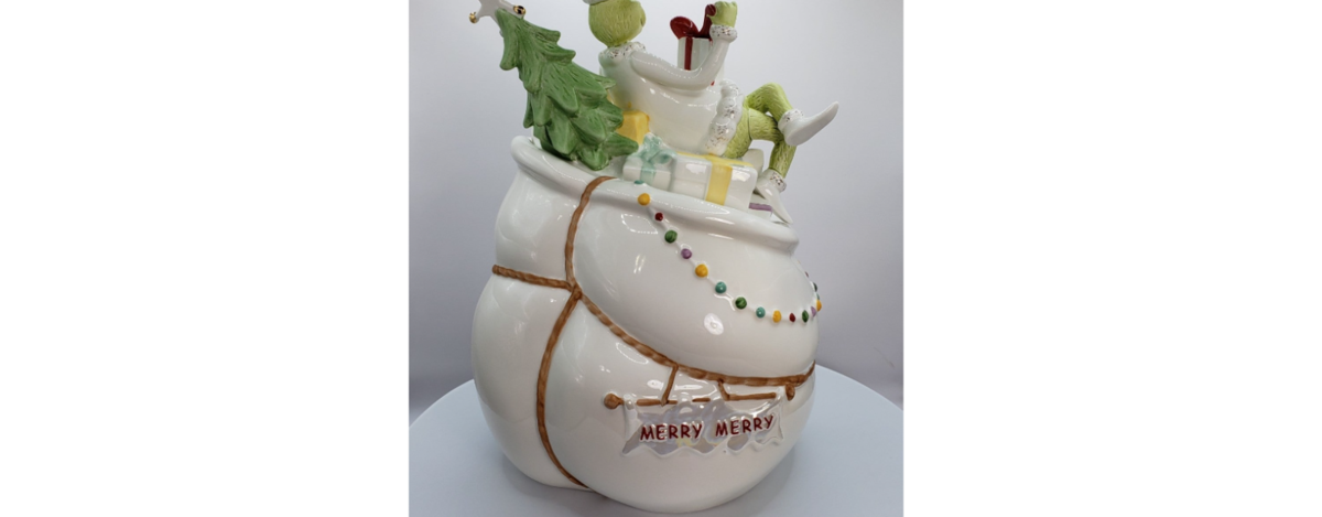 Grinch has stole Christmas... and everyone's heart with this classic cookie jar! Featuring the Grinch on top of a sack of gifts filled to the top, but there's always enough room for more goodies and treats.