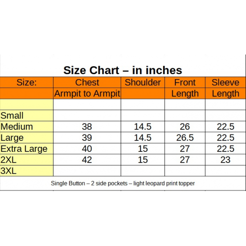 Material: Polyester Blend Collar Button Closure Two side pockets Long Sleeves Color: Brown Black Pattern: Leopard Print Sizes: M, L, XL, 2XL - please measure yourself and compare to the size chart