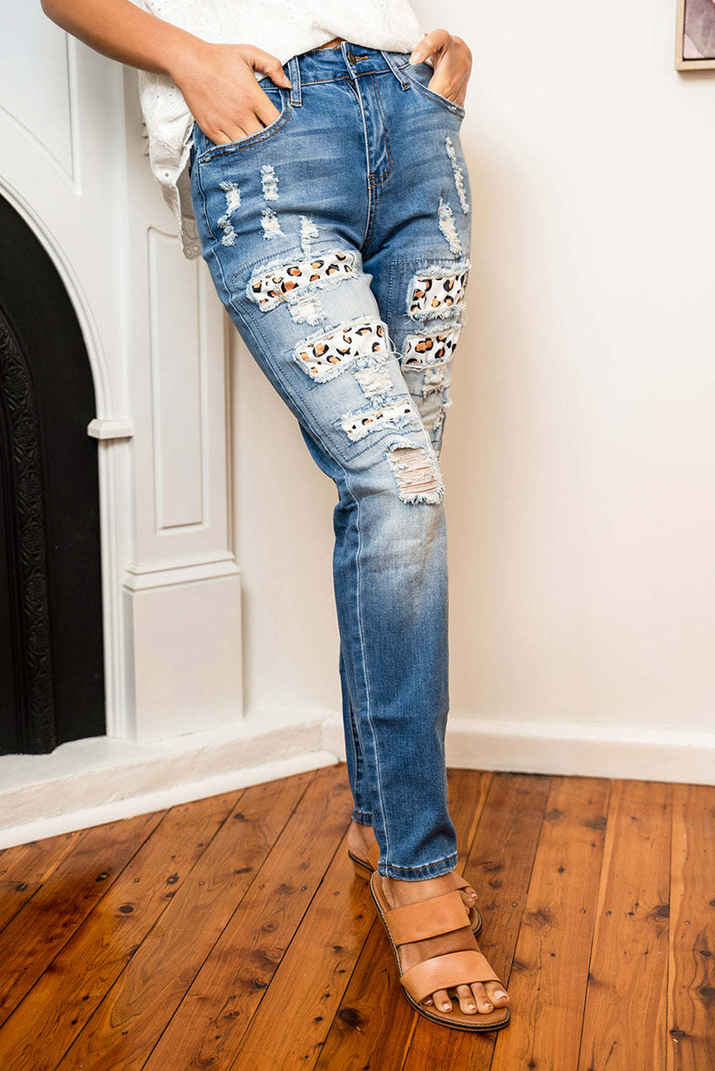 - Leopard Solid Print Patchwork Distressed Jeans with Pockets