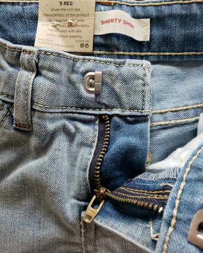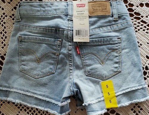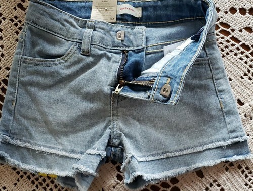 This sale is for one (1) pair of Levi Strauss Co. brand shorty shorts Girl's Size 5 Regular Inseam measures approximately 2.5" Light wash shorts Blue in color Shorty Shorts Hook bar closure with button on outside of shorts Zipper closure Adjustable waistband Soft stretch Five (5) pockets Slim through hip area 72% Cotton ~ 19% Polyester ~ 8% Viscose ~ 1% Elastane Machine wash ~ Tumble dry These shorts are brand new with tags Please view photos for a good description of these shorts Thank you!