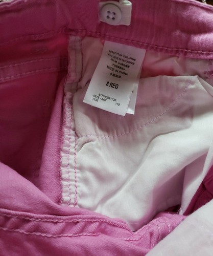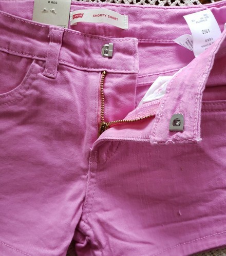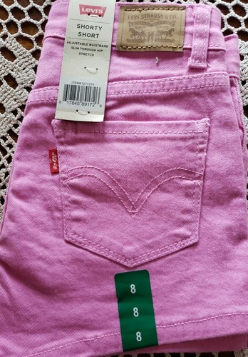 This sale is for one (1) pair of Levi Strauss Co. brand shorty shorts Girl's Size 8 Regular Inseam measures approximately 2.5" Pink in color Shorty Shorts Hook bar closure with button on outside of shorts Zipper closure Adjustable waistband Soft stretch Five (5) pockets Slim through hip area 98% Cotton ~ 2% Elastane Machine wash ~ Tumble dry These shorts are brand new with tags Please view photos for a good description of these shorts Thank you!