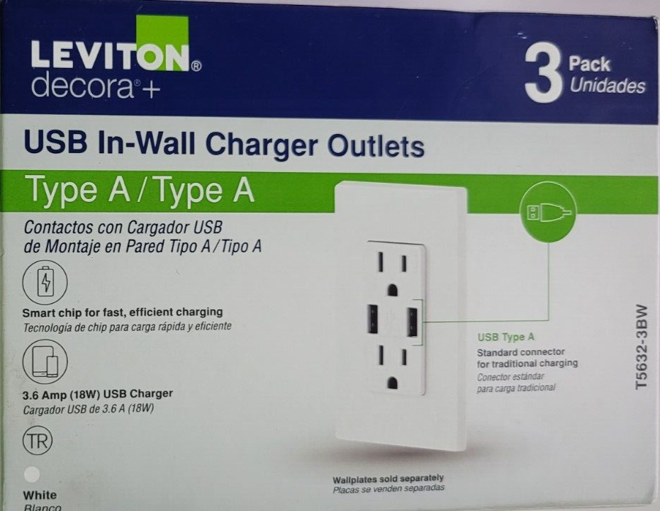 You are Buying Brand New And Factory Sealed Leviton 15 Amp Decora Combination Tamper Resistant Duplex Outlet and USB Charger, White (3-Pack)... USB Charger Devices feature a smart chip that recognizes and optimizes the charging power of your electronic devices for fast and efficient charging. Strategically placed vertical USB Ports in all models provide generous room to insert and maneuver charging cords and add to the contemporary and aesthetically appealing design. Plus, adapter-free charging eliminates unsightly clutter contributing to a neat appearance on countertops, desktops or wherever you choose to charge. Engineered for compatibility with the latest technology, Leviton USB Charger Devices are designed to charge tablets, smart and mobile phones, gaming devices, e-readers, digital cameras and a host of other electronic devices...