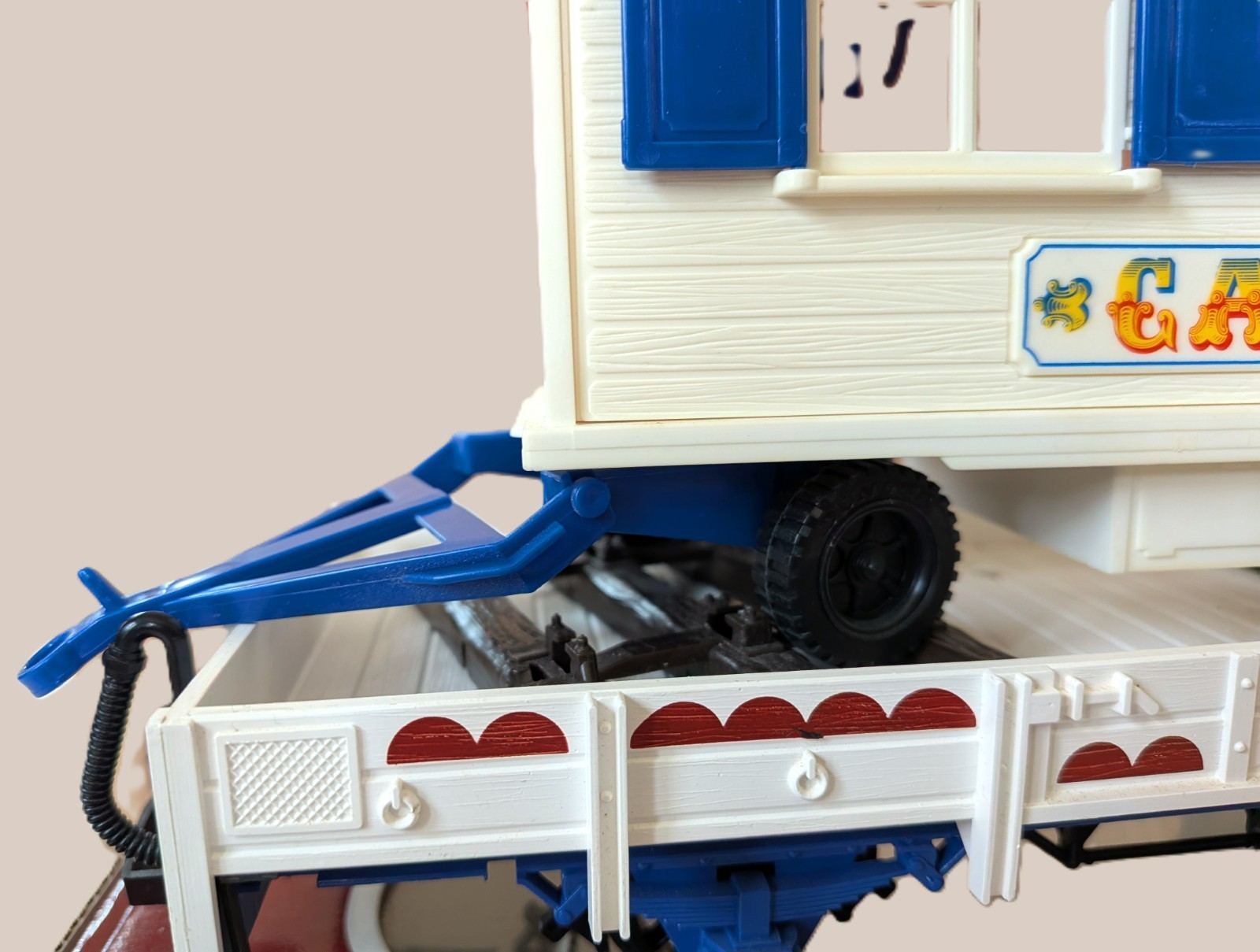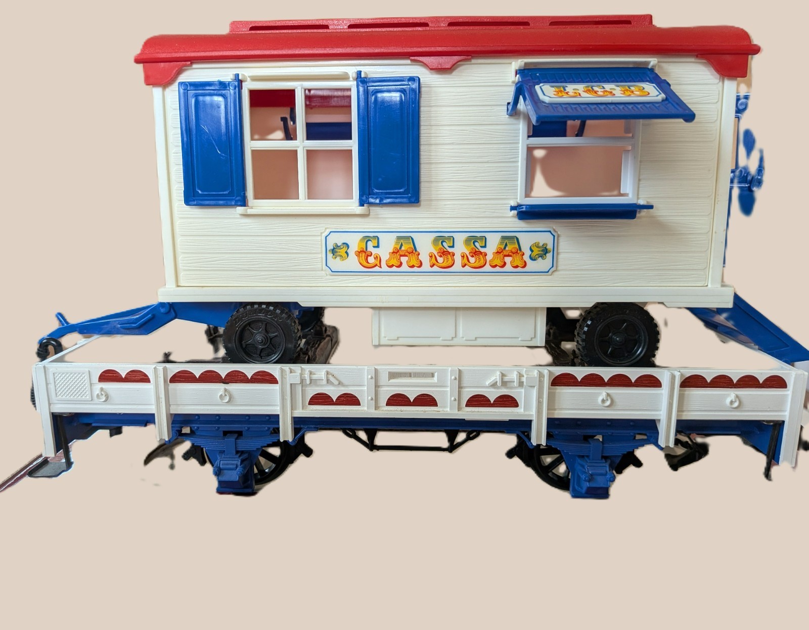 LGB 4037 circus car, white flatbed car with a circus car labeled "Cassa" (tickets), with many movable parts. The circus car itself was made by Bruder. New old stock (NOS) in like-new condition in very good box.