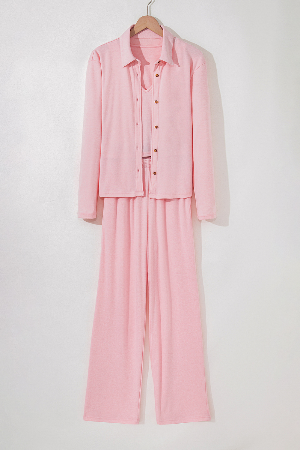 ? This 3pcs lounge set include a buttoned front long sleeve, a vest and a pair of lounge pants.