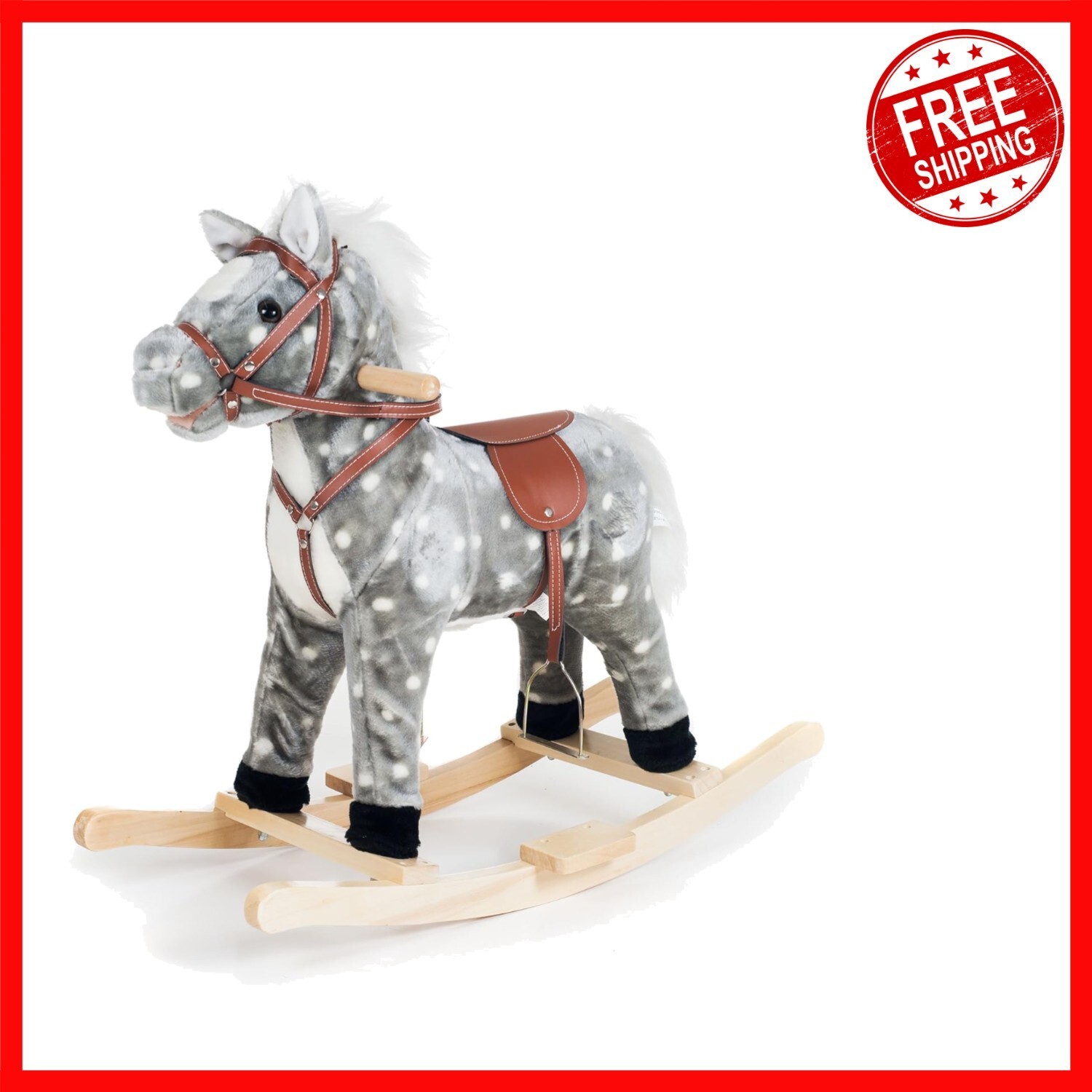 The Plush Rocking Haley Horse from Happy Trails combines craftsmanship and imagination to create a delightful playroom centerpiece. Crafted with a sturdy wood core and plush fabric, this riding toy is designed for children aged 3 and up. Its durable wooden base ensures smooth rocking on flat surfaces, fostering motor skills, coordination, and balance as kids laugh and play. The charming horse design encourages pretend adventures, inspiring kids to envision themselves running through fields or rescuing princesses. Dimensions: 28.5" L x 13.5" W x 26.5" H. Color: Gray. An engaging and safe toy that promises hours of fun, helping children develop essential motor skills while sparking creativity.
