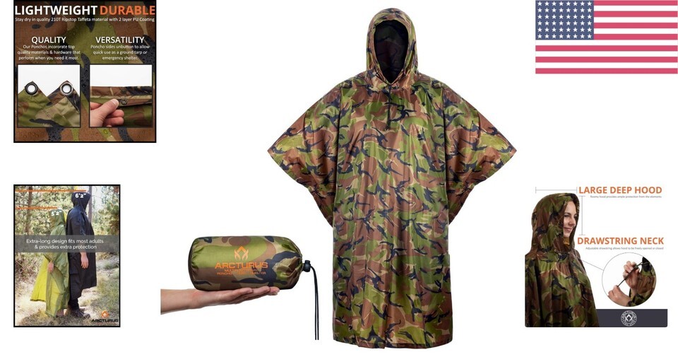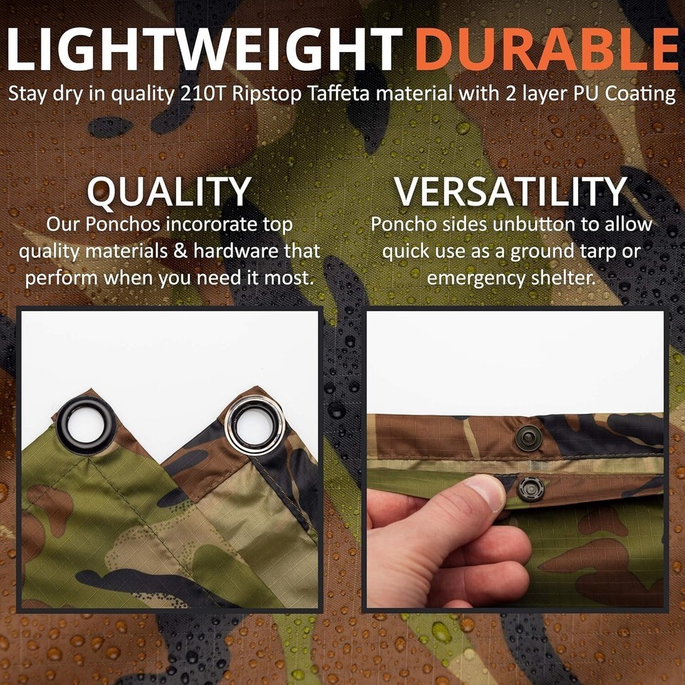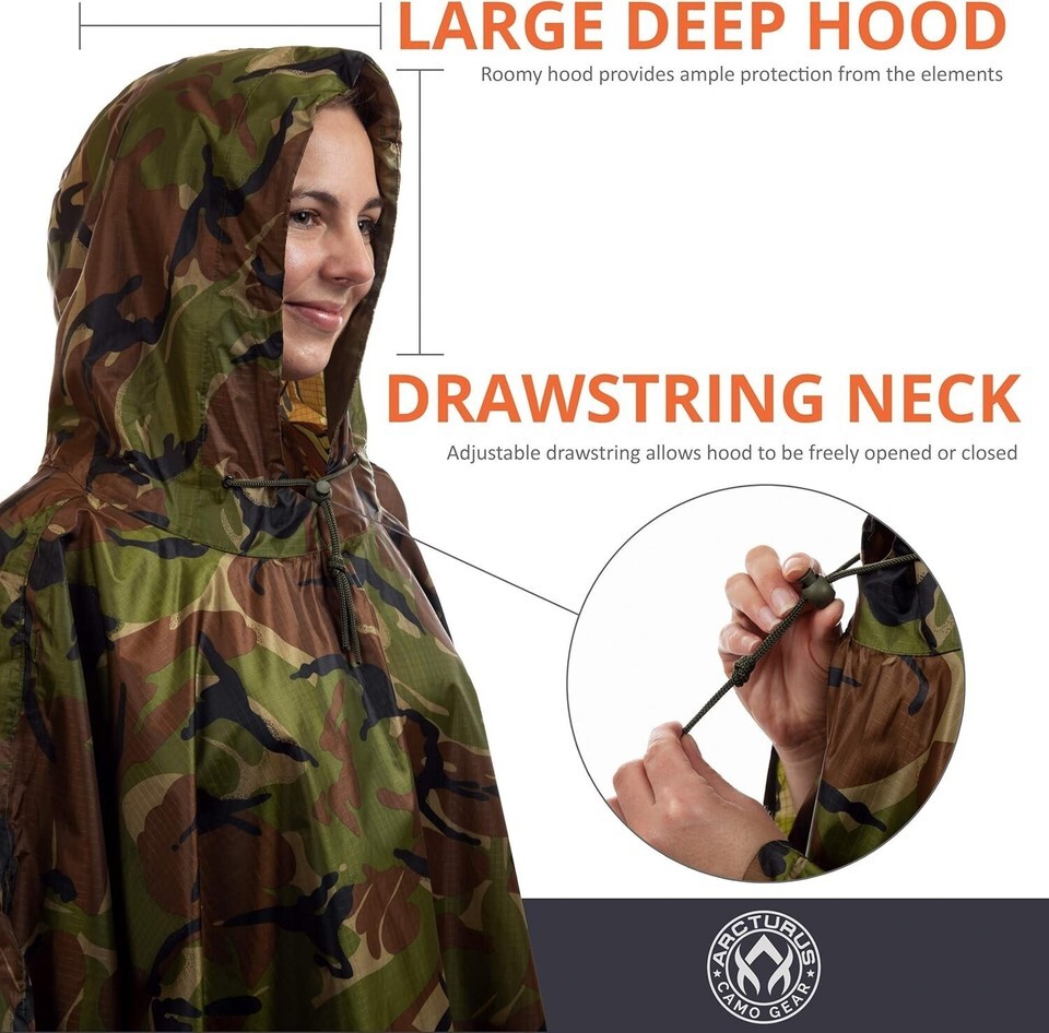 - Lightweight Waterproof Camo Poncho with Adjustable Hood for Outdoor Adventures