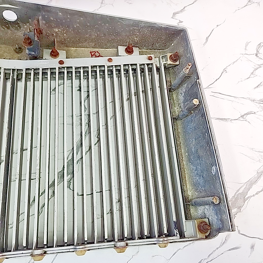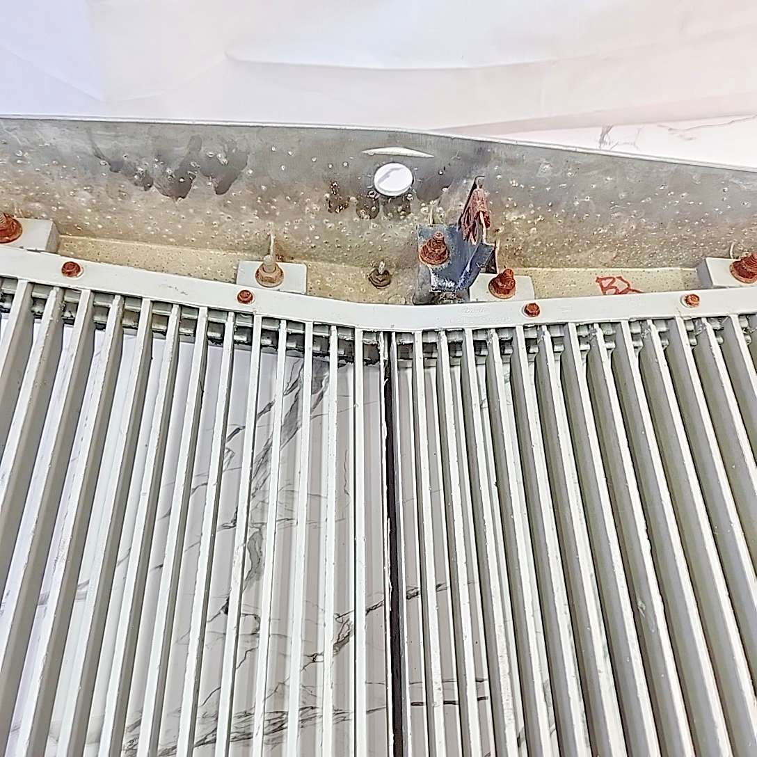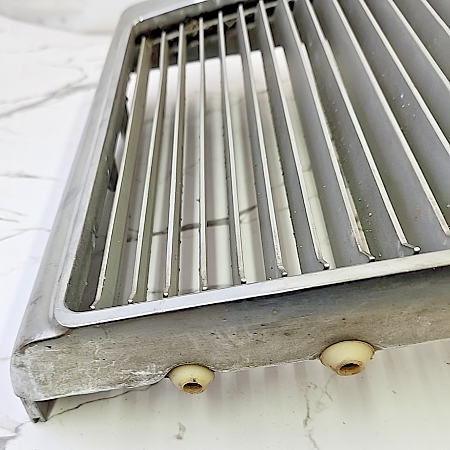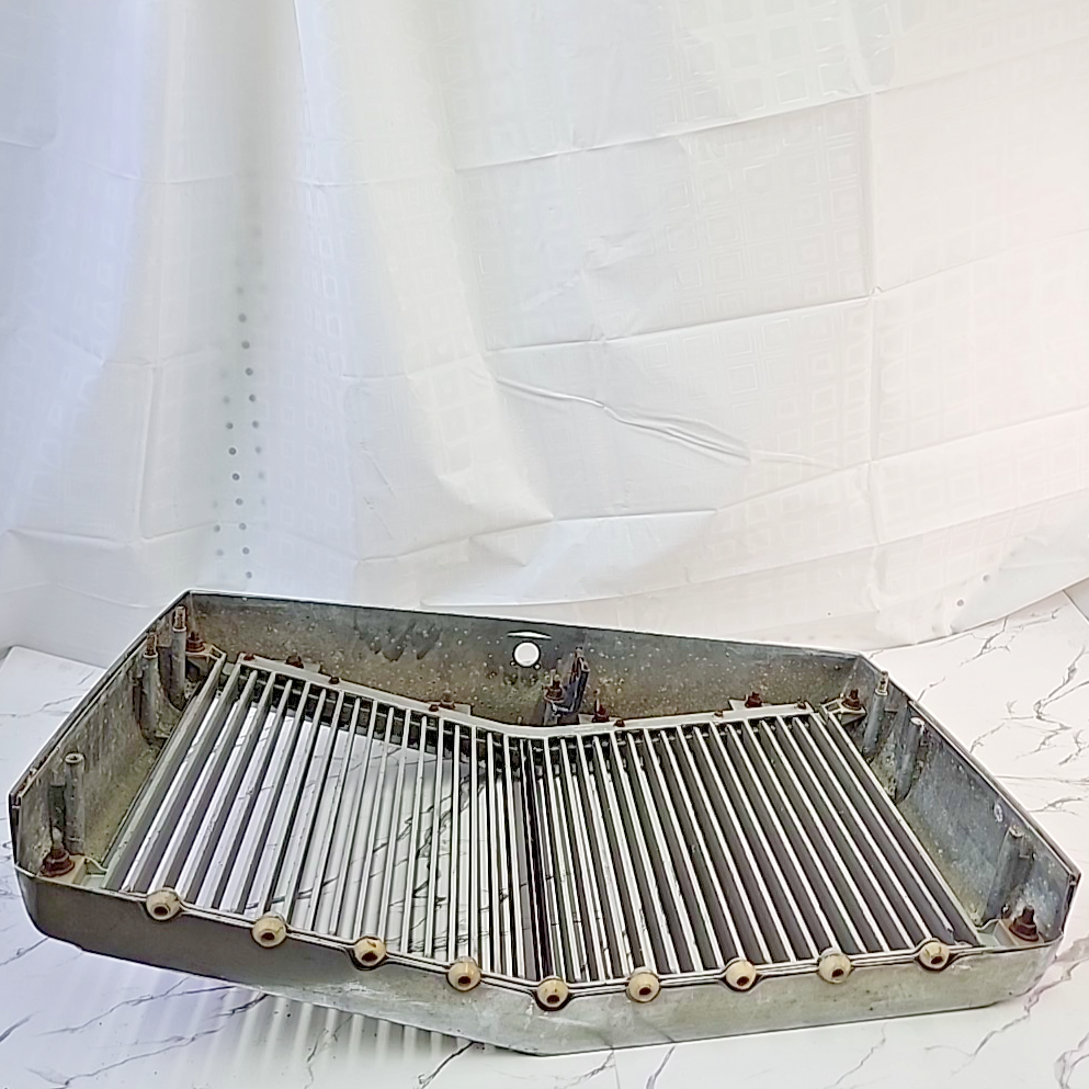 Exact item is shown. Minor pitting on the chrome. This is missing a few of the mounting studs and is listed as-is due to needed repair. Includes the red front emblem shown. Item dimensions approximately 24 x 15 x 5 inches, weight 21 lbs. Made in USA. Please review our business policies in our store for information regarding returns, shipping and warranties.