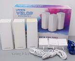 Description: Includes etail Packaging, Linksys Velop AC2200 Tri-Band Mesh Wi-Fi 5 System (3-pack), Ethernet cable, Power adapter (3 pcs). Scratched and yellowed bodies.
