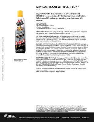 FOR SALE IS ONE (1) NEW CAN OF LIQUID WRENCH DRY LUBRICANT WITH CERFLON PTFE 11 ounce AEROSOL SPRAY CAN WITH RED STRAW MPN L512 UPC# 078698122625. LIQUID WRENCH BRAND DRY LUBRICANT GOES ON AS A LIQUIDM THEN DRIES FAST, LEAVING A WHITE LUBRICANT POWDER TO PREVENT COLLECTION OF DIRT AND DUST. THE LIQUID WRENCH UNIQUE FLUID SUSPENSION, DELIVERS MAXIMUM PENETRATION TO THOSE HARD TO GET TO PARTS AND PLACES. LIQUID WRENCH DRY LUBRICANT CONTAINS STATE OF THE ART CERFLON CERAMICALLY REINFORCED PTFE SOLID LUBRICANT FOR DURABILITY AND LONG LASTING LUBRICATION. CERFLON PTFE's ARE AKIN TO TEFLON AND WORK GREAT ON INTERNAL COMPONENTS. NO STAINING, NO ODOR, NO DIRT PICKUP. LUBRICATES WITH NO OILY RESIDUE. THE LIQUID SUSPENSION ACTS AS A CARRIER FOR THE LUBRICANT POWDER, YET EVAPORATES QUICKLY. USE YEAR ROUND ON ALL HOME, AUTO AND SHOP LOCKS, PROTECTS AGAINS FREEZE UPS, STICKING AND CORROSION, WORKS ON ALL TYPES OF LOCKS MAKING THEM WORK EASIER. LIQUID WRENCH DRY LUBRICANT WITH CERFLON PTFE WORKS BETTER AND LONGER ON NOISY AUTO AND HOME INTERIOR DOOR HINGES AND WINDOWS, HELPS SEAL OUT MOISTURE AND PROTECTS TOOLS, GUNS, FIREARMS, REELS AND OTHER FINE MECHANISMS, QUIETS INTERIOR DOOR HINGES, WINDOWS, SLIDING MECHANISMS. INCLUDES A CLASSIC RED STRAW TO DELIVER RESULTS EXACTLY WHERE YOU NEED IT. MADE IN THE USA FOR LIQUID WRENCH, BY RSC CHEMICAL SOLUTIONS, A DIVISION OF RADIATOR SPECIALTY COMPANY, INDIAN TRAIL, NORTH CAROLINA, USA. YOU WILL RECEIVE ONE (1) 11 ounce AEROSOL SPRAY CAN OF LIQUID WRENCH DRY LUBRICANT WITH CERFLON PTFE ALONG WITH THE RED STRAW SHIPPED BY USPS PRIORITY MAIL.....