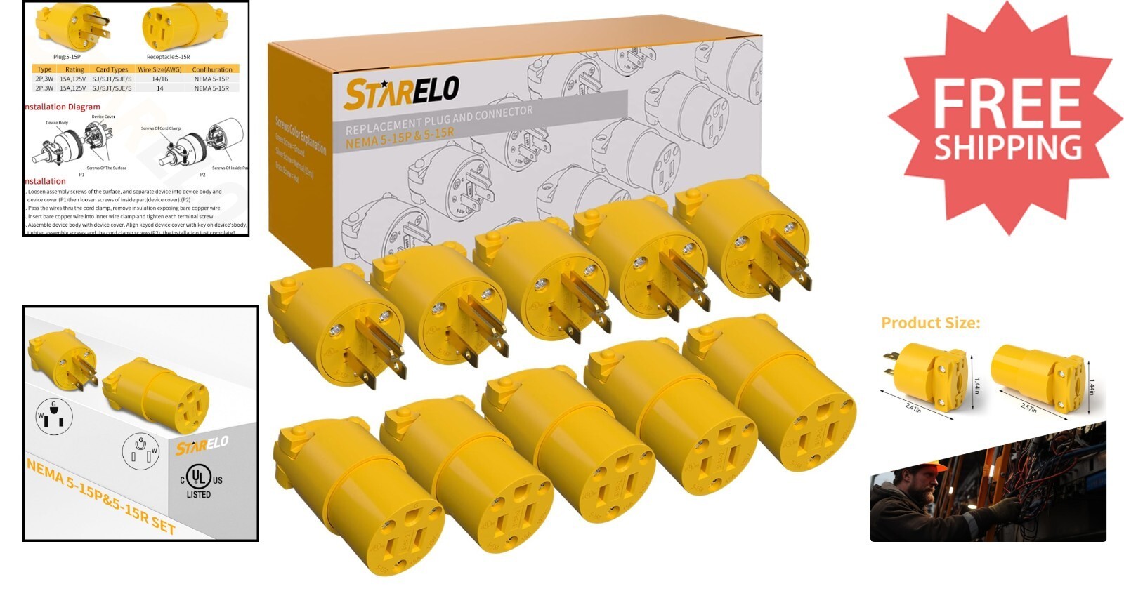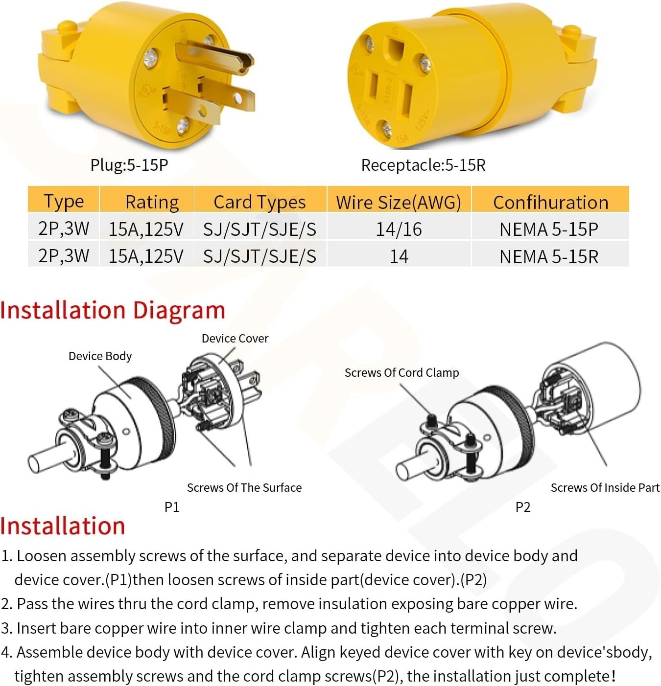 - Listed Electrical Replacement Plug & Connector Set with Yellow Shell 125V 15A