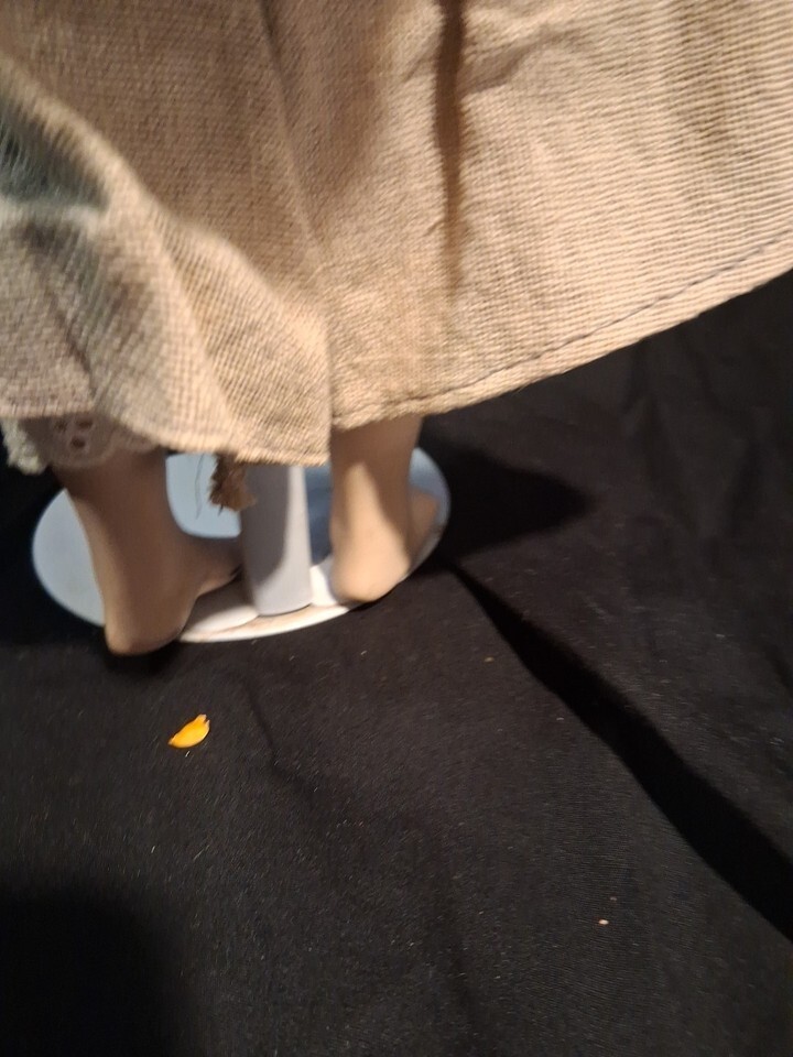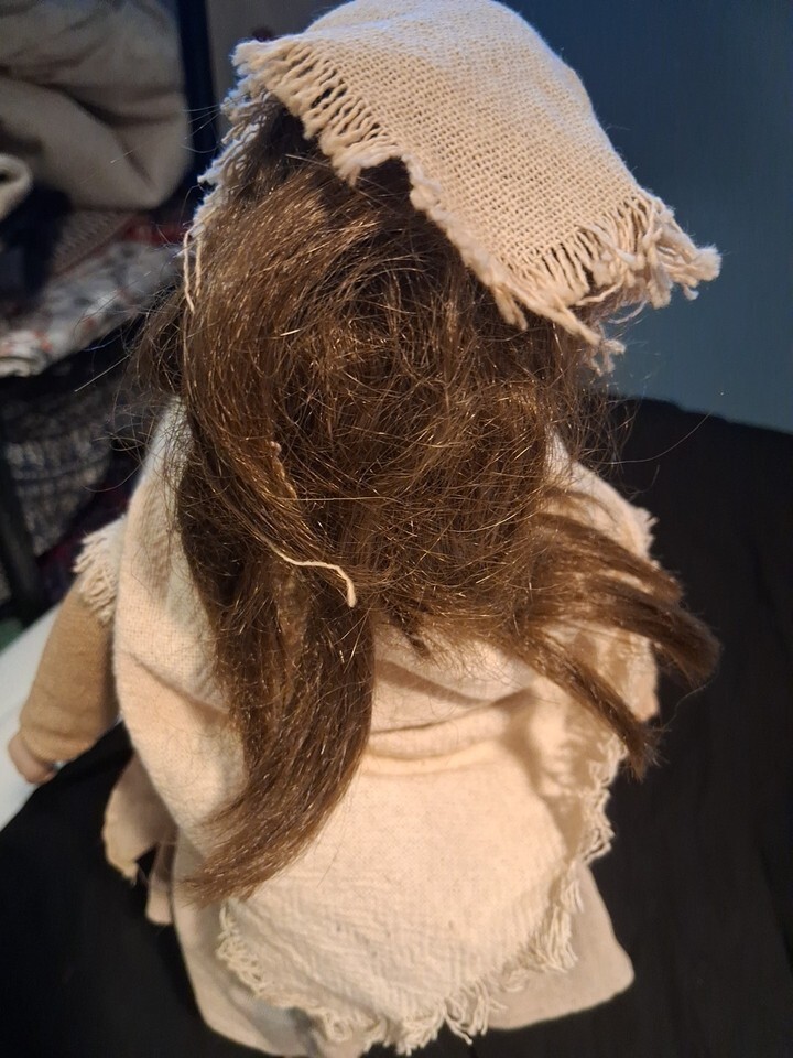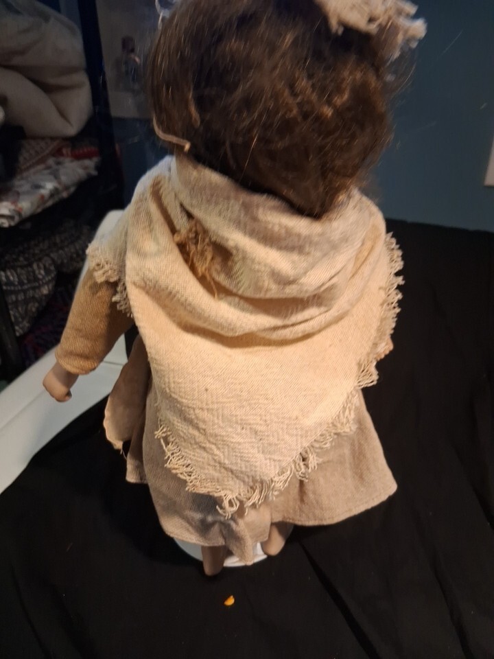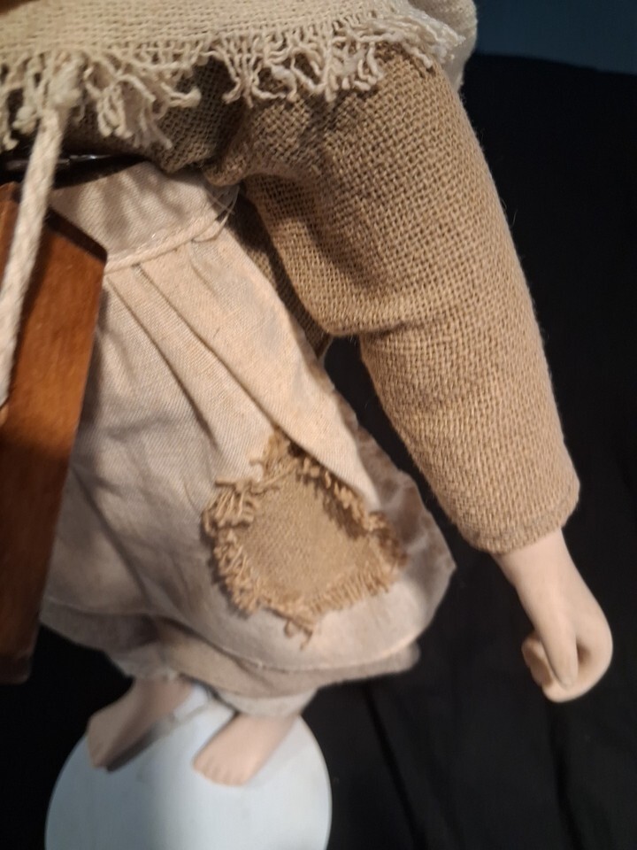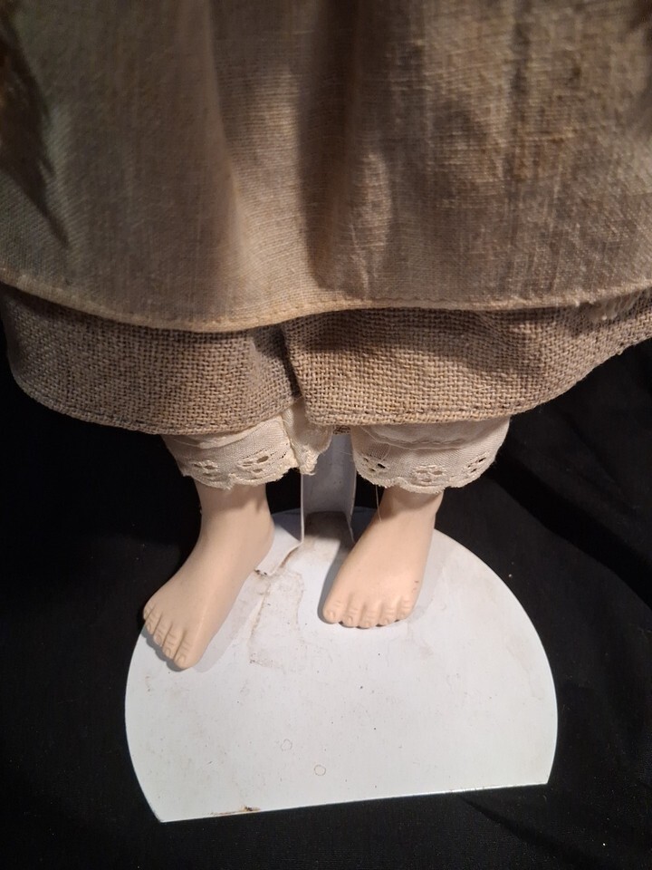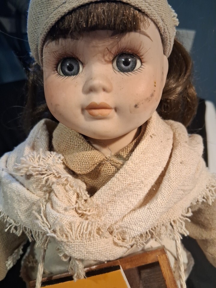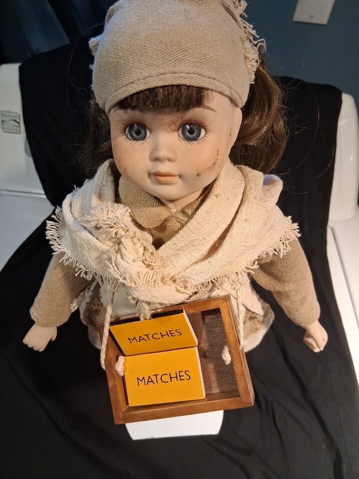 The product is a 15" tall porcelain doll from the Christmas Around the World franchise by House of Lloyd. This vintage doll features the character of the Little Match Girl, with straight hair and a light complexion. The set includes a display stand and the doll, making it a realistic and lifelike addition to any Christmas decor collection. Without bix, this retired doll, it offers a nostalgic touch to holiday celebrations.