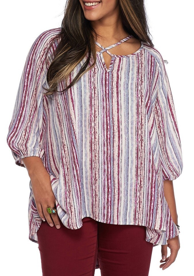 Bring a fashionable look to your wardrobe with this juniors' Living Doll top. This bold paintstripe blouse is ideal for day-to-day events. Its sassy silhouette features a high low hem and a keyhole neck for a lightweight and airy look. Its vibrant purple design will add a punch of color into your wardrobe.