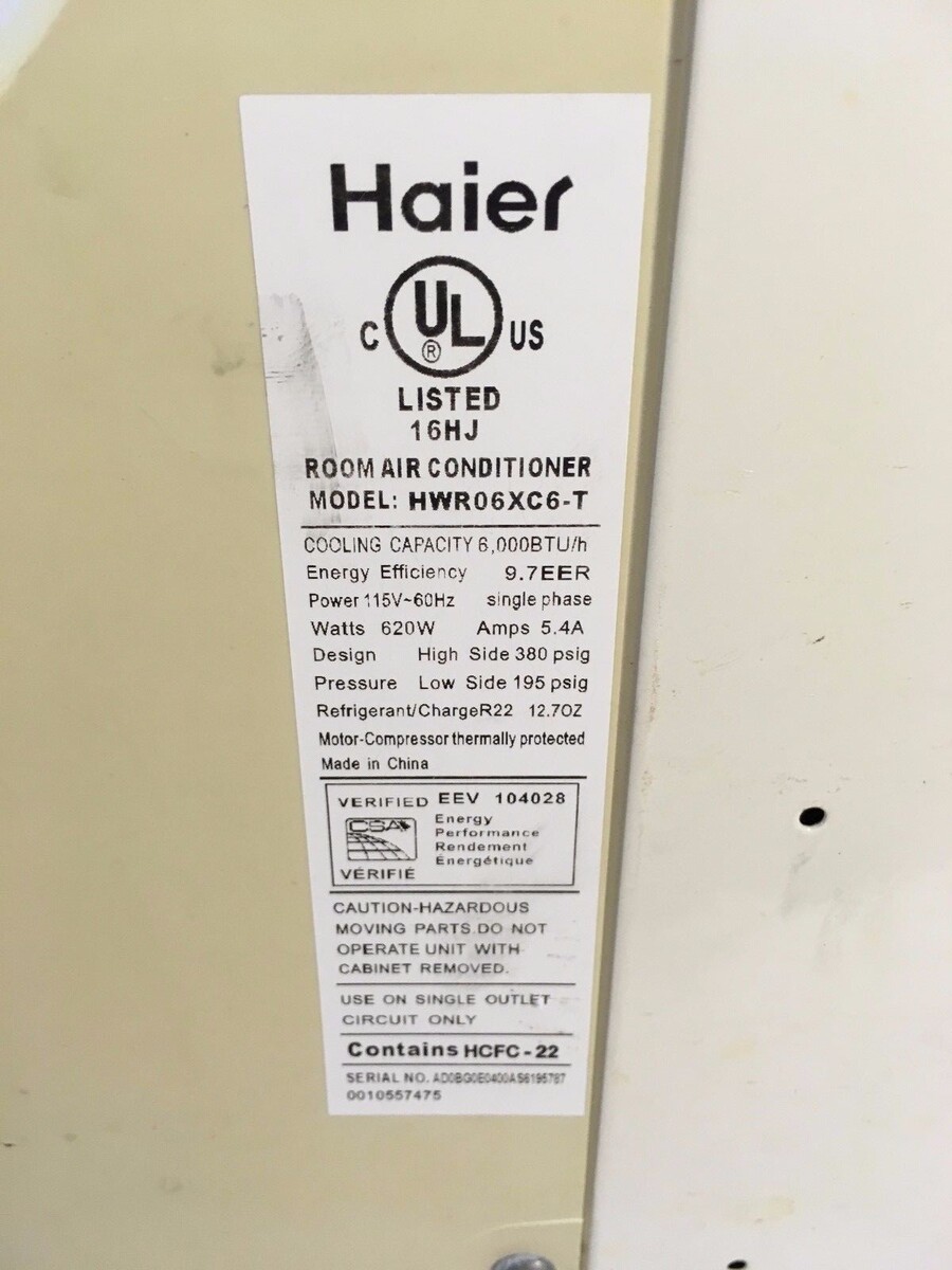 ITEM : LOCAL PICKUP Haier Model HWR06XC6-T 6000 BTU/HR R22 Window Air Conditioner SIZE: 6000 BTUs / Approx. 19" X 15" X 13" COLOR : White / Tan DEFECTS : Surface Scratches / Missing Front Grill ~ See Photos AC Unit Still Blows Cold Air Though!! LOCAL PICKUP ONLY!!!! IF YOU FIND ANYTHING WRONG WITH THIS LISTING , PLEASE MESSAGE ME RIGHT AWAY AND I WILL FIX IT, OUR GOAL IS TO 100 PERCENT SATISFY YOU. Thank You for looking at my Store. I am a United States Army Veteran and our Store is Veteran Owned and we count on an honest transaction. We have a no hassle return Policy. It?s really simple if you don?t like it please return the item and I will issue you a refund. I have quickly learned that Customer Satisfaction is the number one Priority. My Store is open for Business and I invite everyone to take a quick look at what I have...Just click here and see all that I have View more great items
