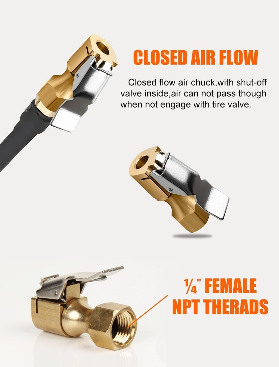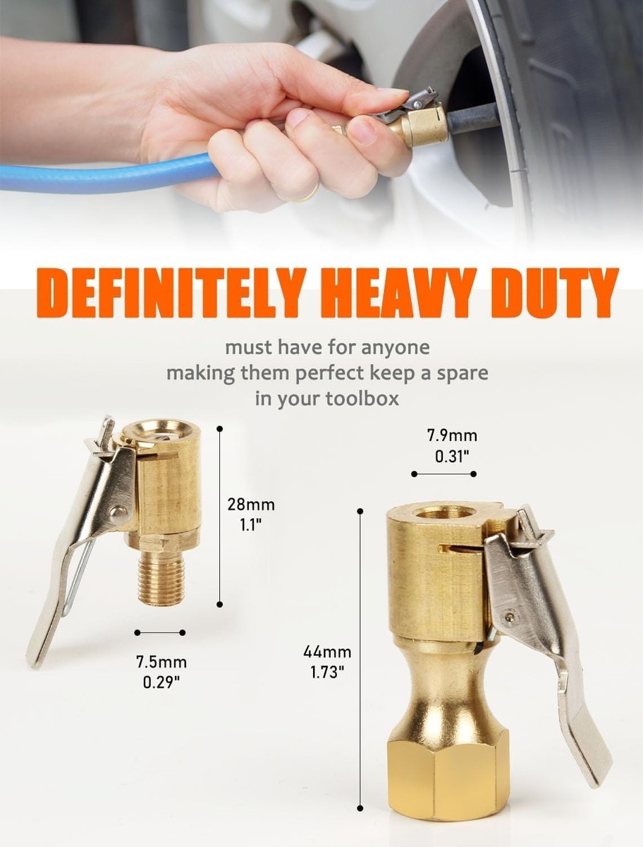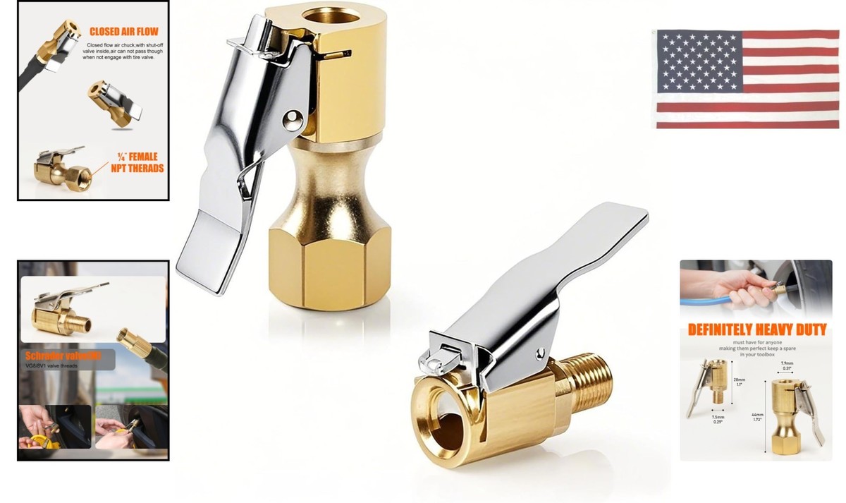 Lock On Air Chuck, Heavy Duty Brass Closed Flow Locking Chuck, 2 Pack, 1/4-Inch Female NPT, for Tire Inflator Gauge/Compressor Accessories ? ? ? ? ? ? ? ? ? ? ? ? ? ? ? ? Lock On Air Chuck - Heavy Duty Brass Closed Flow Locking Chuck Pack of 2 | 1/4-Inch Female NPT | Ideal for Tire Inflator Gauge and Compressor Accessories Key Features: Heavy-Duty Construction: Each air chuck is crafted from solid brass, guaranteeing higher strength and exceptional durability. Designed to withstand the demands of frequent use. Closed-Flow Design: Allows air to flow only when the internal valve is open, directly aiding in accurate tire inflation. Easy Connection: Features a self-locking mechanism that keeps the chuck firmly in place. Releasing and connecting is effortless, providing a seamless experience. High-Pressure Rating: Built to handle a maximum pressure of up to 250 PSI, ensuring you can maintain ideal tire pressure safely. Wide Applicability: Suitable for a variety of vehicles including cars, motorcycles, bikes, and more that utilize Schrader valves. Why Choose Our Lock On Air Chuck? When it comes to maintaining your vehicle's tires, precision and reliability are paramount. Our Lock On Air Chuck is expertly engineered to provide a secure, leak-free seal during tire inflation, ensuring your tires are always at optimal pressure. The solid brass construction provides not only strength but also superior resistance to corrosion and wear, extending the life of your tire inflator accessories. Enjoy the confidence that comes with easy-to-use locking mechanisms and a design tailored for efficiency. Upgrade your tire maintenance toolkit today with our Lock On Air Chuck Set - the durable choice for the discerning vehicle owner. Don't settle for less; choose quality and reliability every time! Shipping Free Fast Shipping - We offer free shipping to most of the USA with a normal delivery time of 3-7 days. However, due to the current situation, additional delivery time (up to 3 weeks) may be required for some items. Alternative Carriers - We may use alternative carriers (e.g. USPS, FedEx, UPS, etc.) to ensure your package arrives safely and on time. Due to the use of multiple carriers, we are unable to provide a tracking number automatically. Handling Time - Orders are processed and shipped within 1-2 business days of receiving cleared payment. Shipping Restrictions - Shipping to Alaska, Hawaii, Puerto Rico, Guam, and other US territories may incur shipping charges or delivery restrictions. Please contact us before ordering, or your order can be refunded/cancelled. State Restrictions - There may be restrictions based on your state of purchase. For example, certain items may not be shipped to California due to state regulations. Contact for Tracking Updates - If you require tracking updates or have any concerns about the delivery of your order, please feel free to contact us, and we will be happy to assist you. Return 30-Day Hassle-Free Returns - We want you to be completely satisfied with your purchase. If you are not, you can return the item within 30 days of receiving it for a full refund or exchange. Easy Return Process - To start a return, simply contact us and we will provide you with a prepaid return shipping label and detailed instructions. Restocking Fee - There are no restocking fees for returns. However, the buyer is responsible for return shipping costs if the return is not due to a seller's error. Refund Processing Time - Refunds will be processed within 5 business days of receiving the returned item in its condition. Payment We accept all major credit cards, PayPal, and Apple Pay for your convenience. Your payment information is secure and encrypted to ensure a safe and seamless transaction. Please complete your payment within 3 days of purchase to avoid any delays in shipping. Feedback Your feedback is extremely important to us. We strive to provide the best products and customer service possible. If you are satisfied with your purchase, please take a moment to leave us a positive review. If you have any concerns or issues with your order, please contact us before leaving negative feedback. We are committed to resolving any problems and ensuring your satisfaction. Contact Us If you have any questions or concerns, please feel free to out to our customer support team. You can contact us through the messaging system. We are available Monday to Friday, 9:00 am to 5:00 pm EST, and we will do our best to respond to your inquiry within 24 hours. Buy it now and enjoy a pleasant shopping experience! UPC: NA Thread Size: 1/4-Inch female NPT Package Dimensions: Not specified Manufacturer: Safelife Model: Lock on air chuck Item model number: SF-1919 Style: Heavy Duty Item Weight: Not specified Special Features: Closed-flow design Items Included: Clip Adapter Material: Brass Features: Durable,Easy to Install and Use,Anti-corrosion Placement on Vehicle: Universal Manufacturer Part Number: SF-1919 Finish: Not specified Type: Air Chuck Color: Brass Number in Pack: 2 Outside Diameter: Not specified Centering: Not specified Inside Diameter: Not specified Thread Direction: Not specified