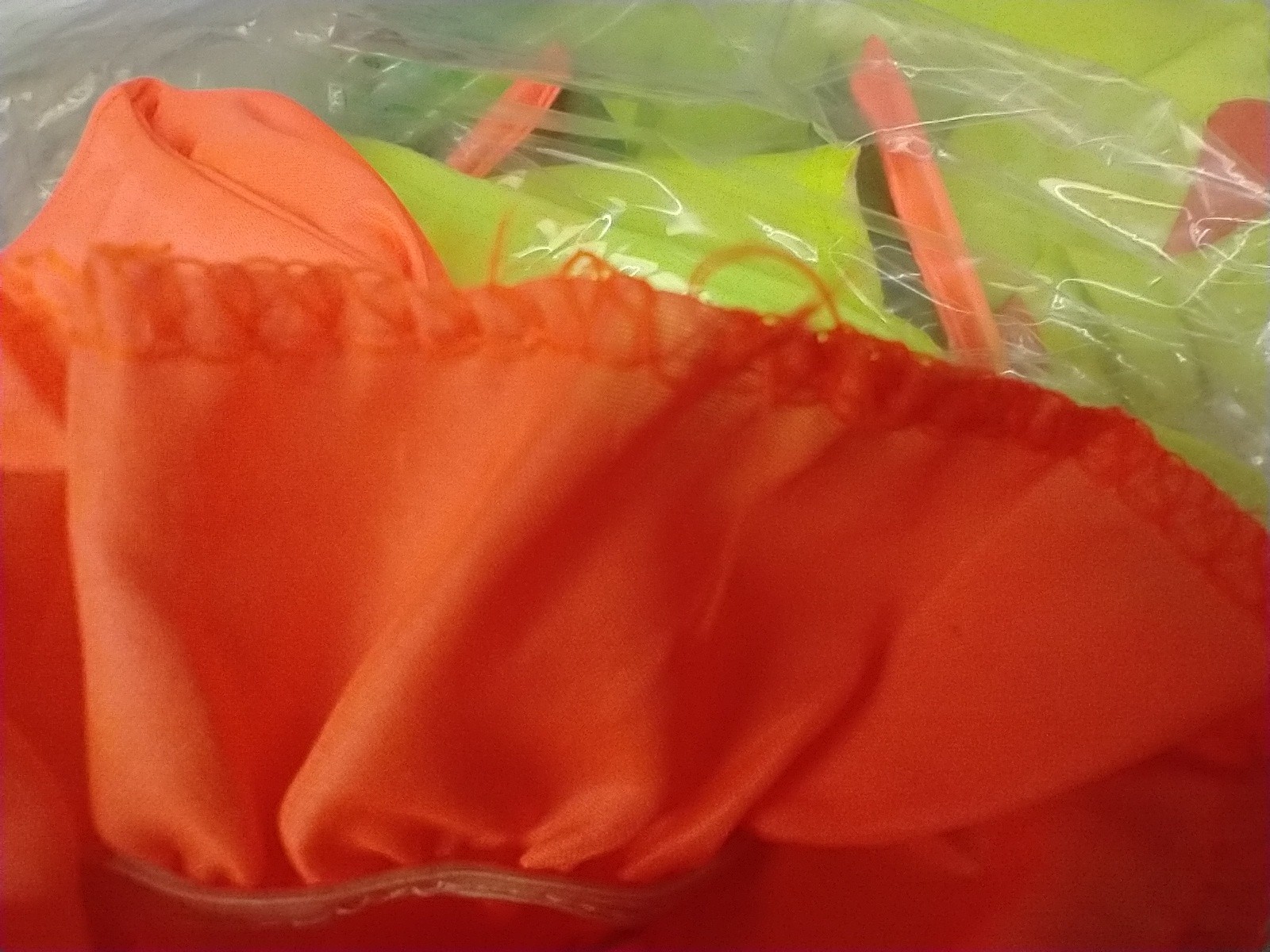 look more neon yellow to me. The pantaloons are bright orange. Shoe Covers to