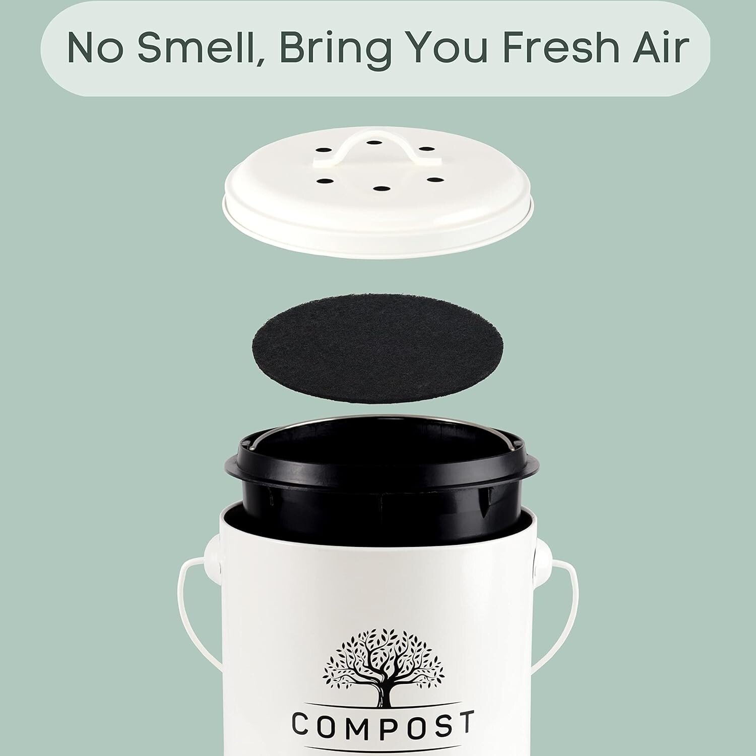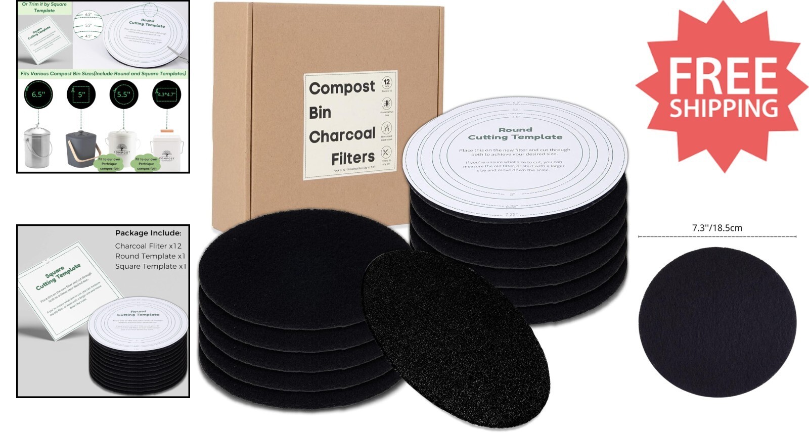 Enjoy fresher indoor air with our Happy Composting! activated charcoal filters. This set includes 12 round filters, each 0.2 inches thick, designed to effectively absorb and trap odors from your kitchen compost bin. Easy to install?simply peel, remove, and replace?these filters are compatible with most bins up to 7.3 inches in diameter. Bonus included: free cutting templates for perfect fitting, whether round or square. Crafted from , eco-friendly activated charcoal, they help create a clean, odor-free environment while supporting a sustainable lifestyle.