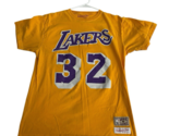 The product is a men's medium yellow #32 Magic Johnson T-shirt jersey style by Mitchell Ness, officially licensed by the NBA. It is designed for fans of the Los Angeles Lakers and is perfect for representing the team during the playoffs or regular season games. Made in the United States, this shirt is a stylish and comfortable way for basketball enthusiasts to show their support for one of the most legendary players in NBA history.