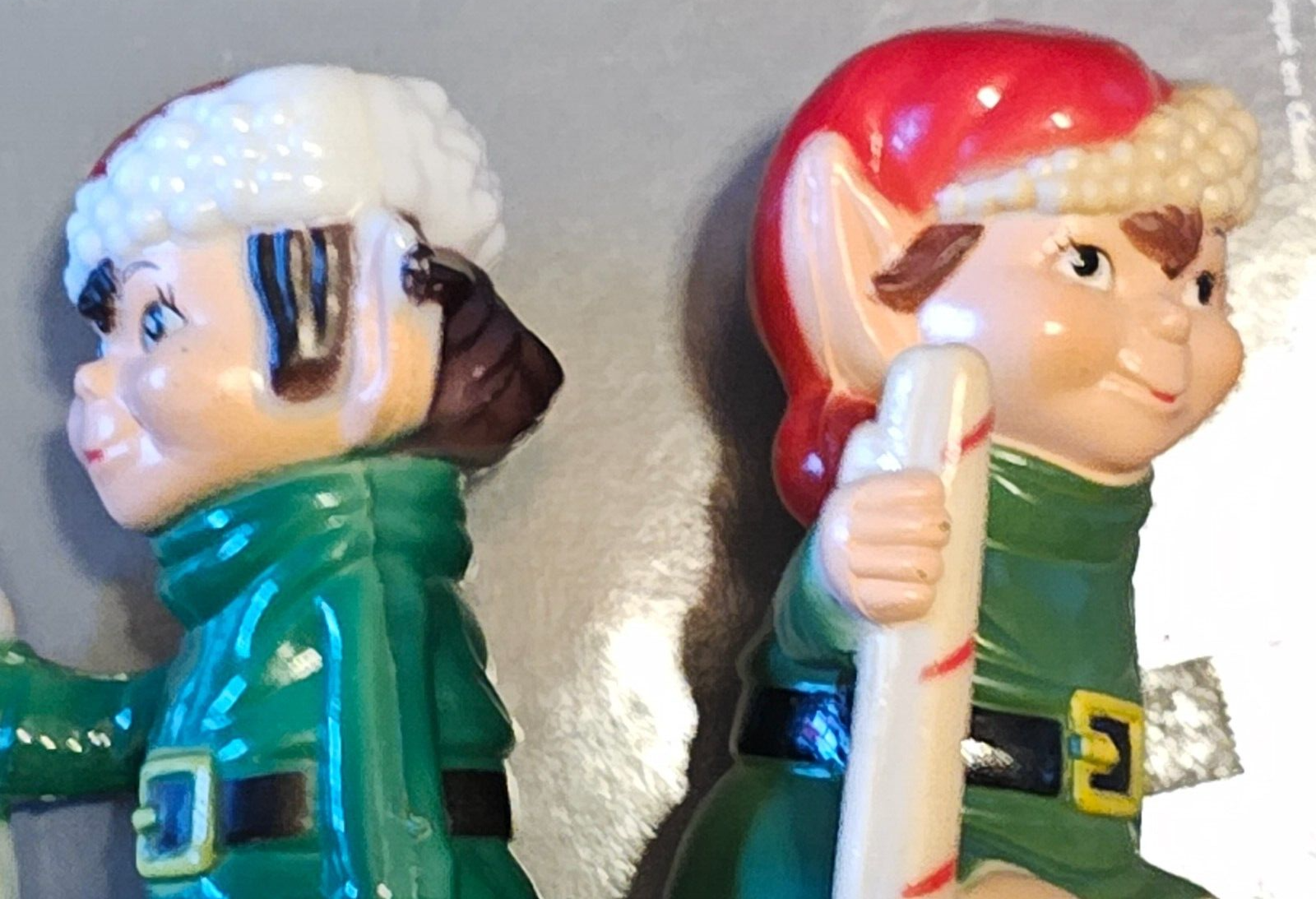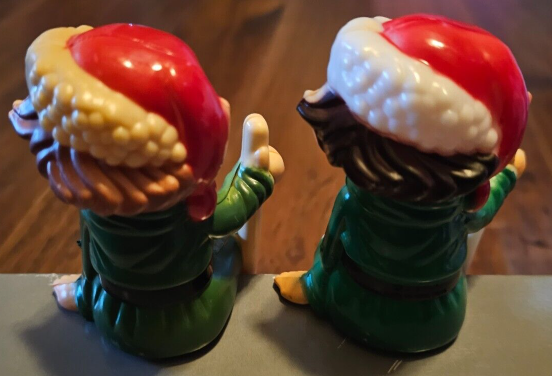 Primary image for Lot 2 Vtg Plastic Christmas Stocking Holder Pixie Elf Hangers 1 Blk Hair & 1 Brn
