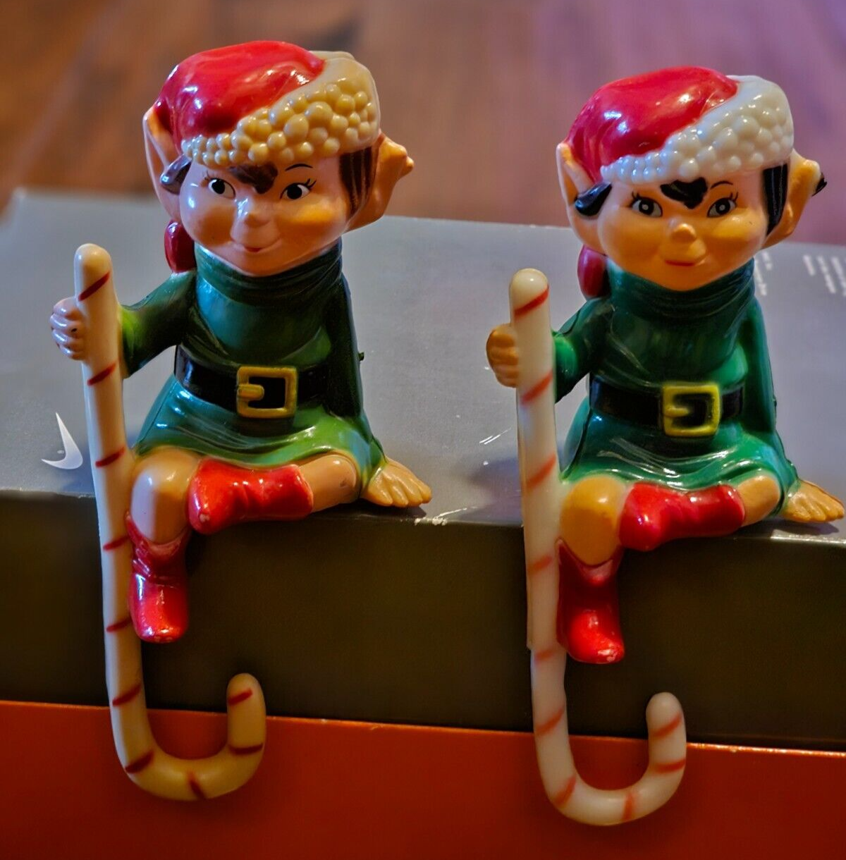 Lot 2 Vtg Plastic Christmas Stocking Holder Pixie Elf Hangers 1 Blk Hair & 1 Brn