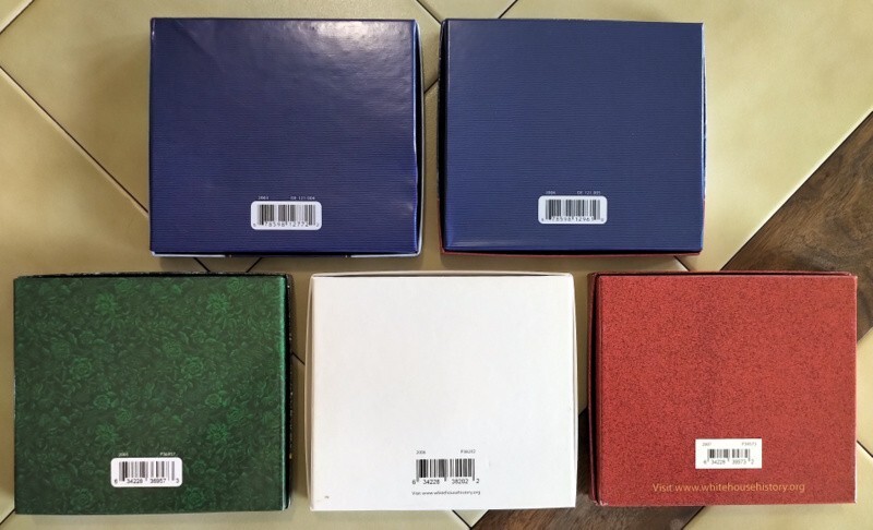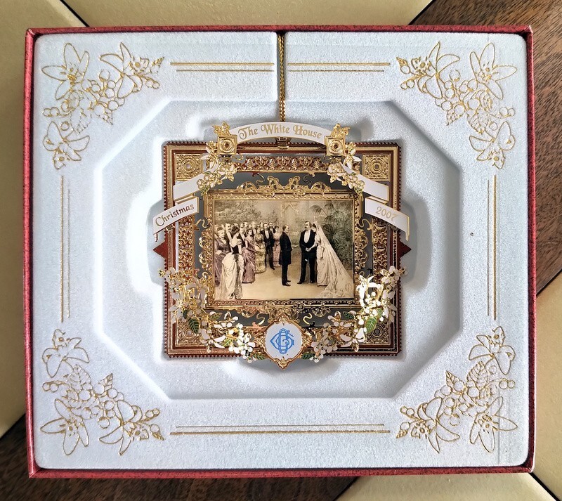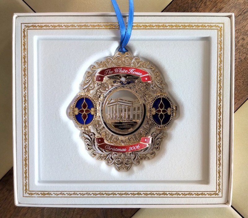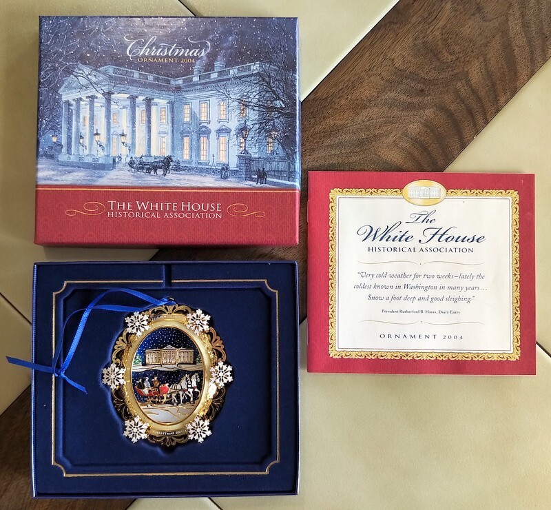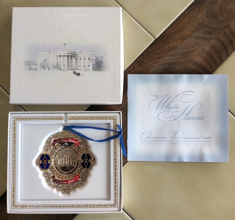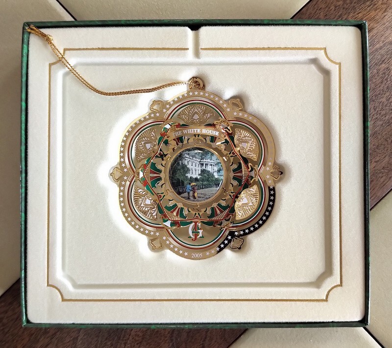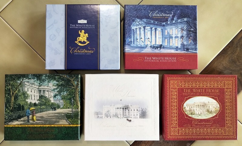 Lot of (5) White House Historical Association Christmas Ornaments. Included are the official ornaments in original boxes for years 2003, 2004, 2005, 2006 and 2007. Each piece features intricate gold-tone detailing and represents an era of White House history. CONDITION: New - excellent. Ornaments were purchased new and have only been removed from their boxes to photograph.