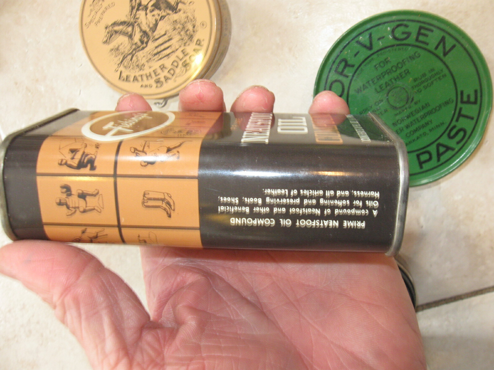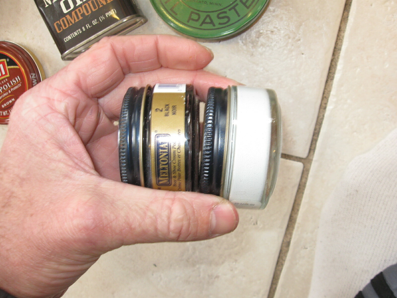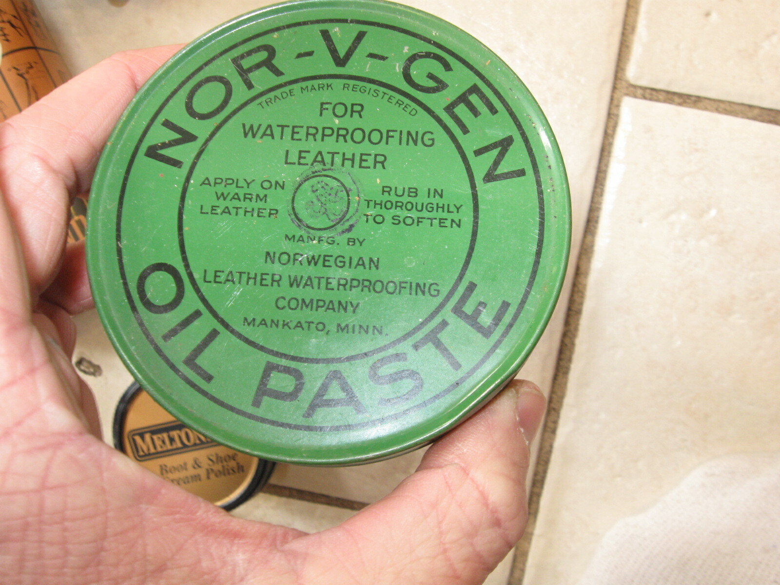 BEAUCOUP de cirage de chaussures en cuir VOUS OBTENEZ : Pate d'huile Nor-V-Gen avec environ 4/5 de remplissage (comme on le voit) Pot Meltonian Black 2 (COMPLET), Pot Meltonian Medium Brown 11 (COMPLET) Pot Meltonien Creme Blanche 171 (4/5 Plein) Savon de selle en cuir Propert (plein, mais le savon est moisi) Compose d'huile de pied de b?uf Fiebing's Prime (COMPLET et vintage !!!) Cirage a chaussures marron kiwi (COMPLET) C'est BEAUCOUP. Vous obtenez toutes ces bonnes choses. Tres vintage et reste longtemps sur les etageres. Le plus COMPLET. Voir les photos EXPEDITION GRATUITE