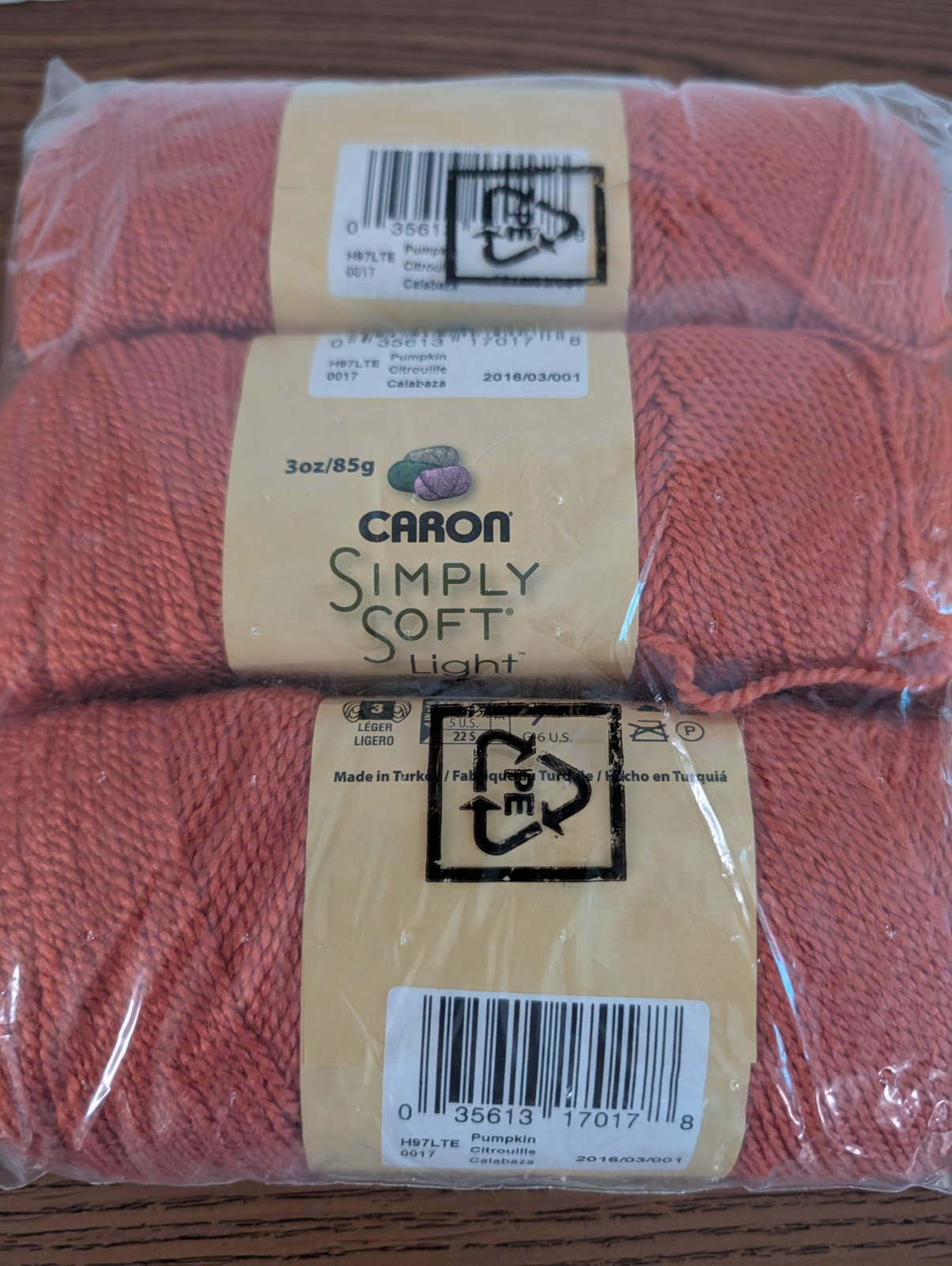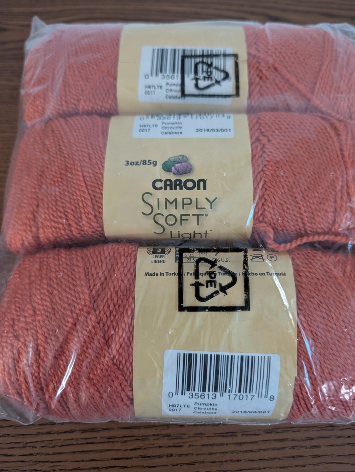 The product is a lot of three Caron Simply Soft Light Yarn balls in the Pumpkin color, a warm orange shade. This yarn is part of the Simply Soft product line by Caron, known for its softness and ease of use in various crafting projects, especially knitting or crocheting. Perfect for creating cozy and festive items such as blankets, scarves, or pumpkin-themed decorations.