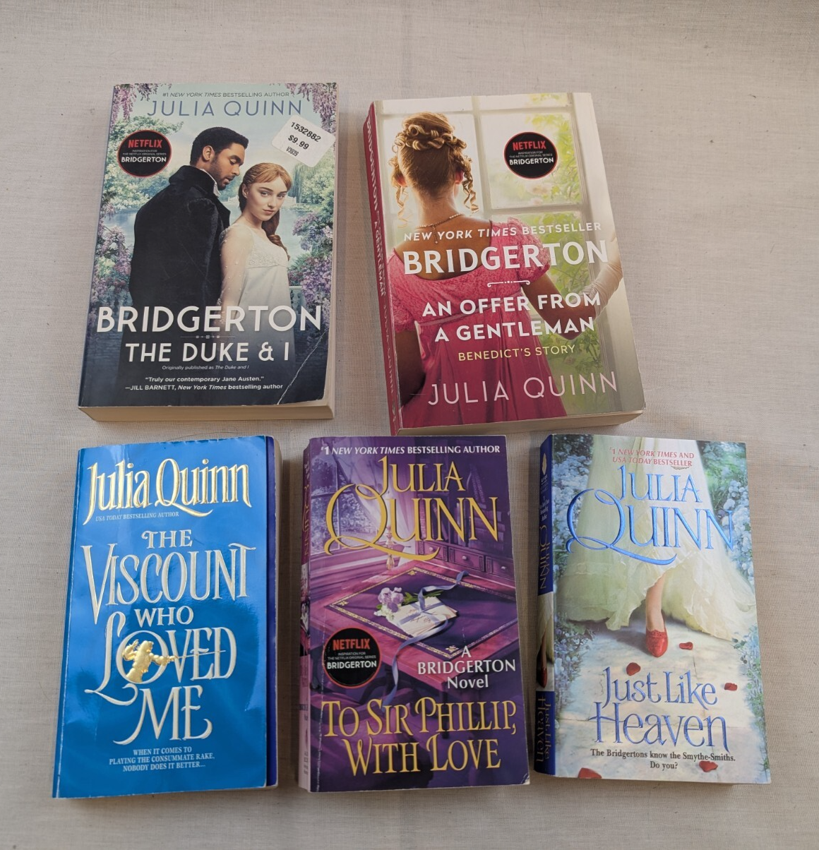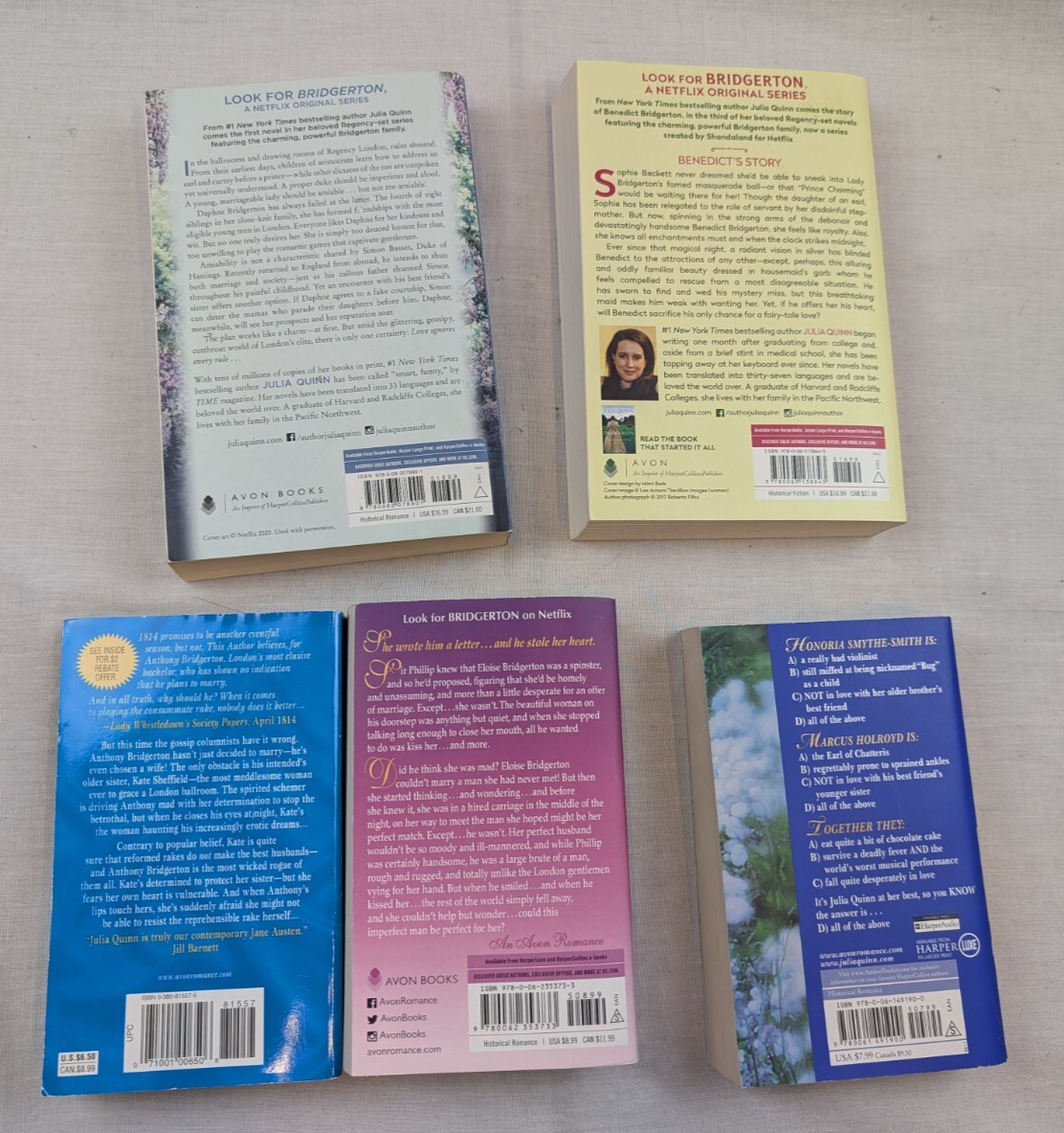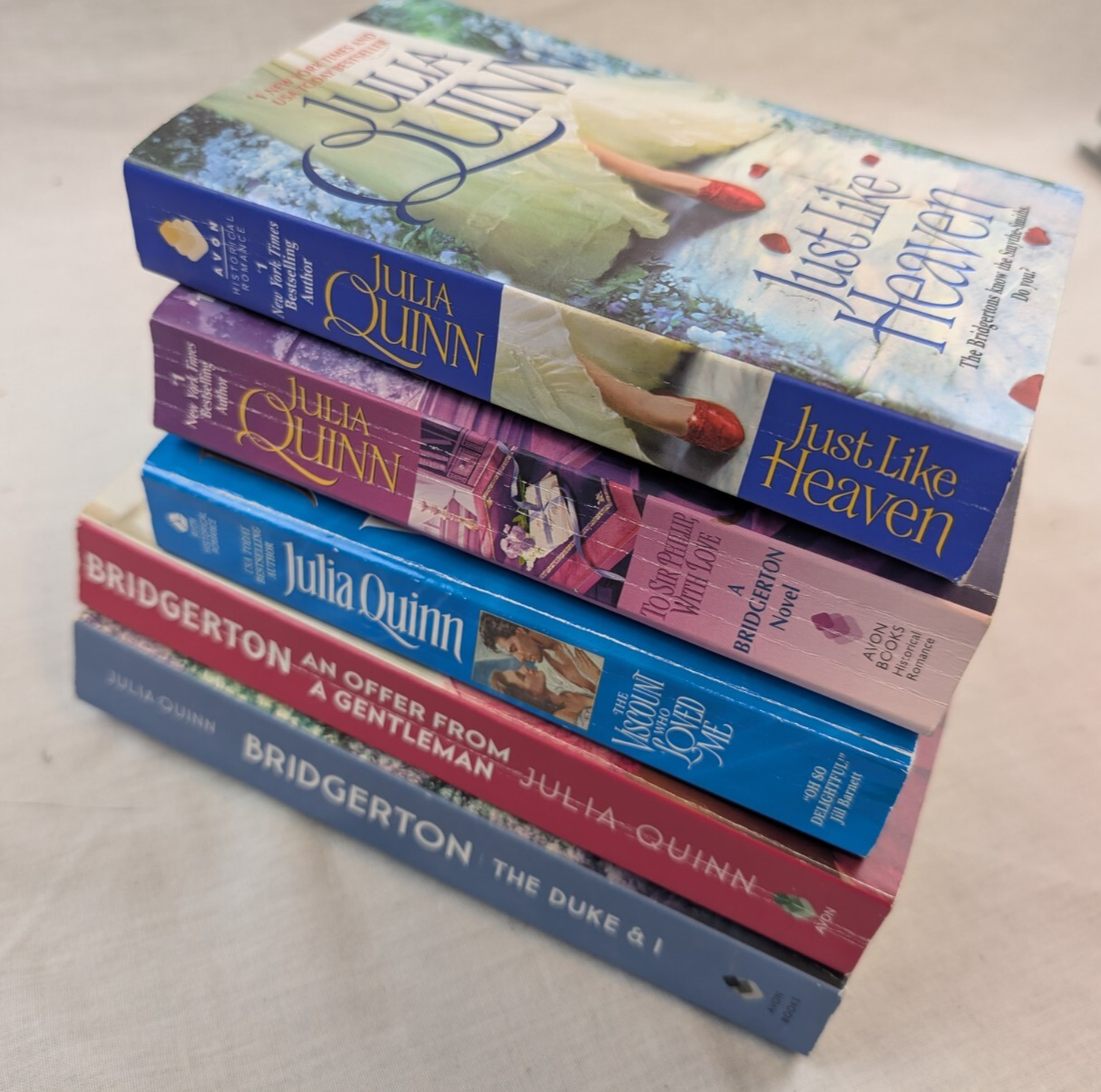 Up for sale is a Lot Of 4 Bridgerton Series Books by Julia Quinn Netflix Paperback #1 2 3 5 + bonus "Just Like Heaven (a Smythe-Smith novel) Buyer to pay for USPS Media Mail, Ground Advantage or Priority Mail shipping. I ship no later than next day after payment. I will combine shipping if paid together. If you buy multiple items from me, please wait for a combined invoice before paying. I will accept returns within 30 days. From a smoke free home I am an honester who buys and sells things to have fun and make a little extra cash -- this is not my primary job. If for any reason you are not completely happy please let me know before leaving negative or neutral feedback, leaving less than 5 on the Detailed Seller Ratings or getting involved and I will make it right. Thanks
