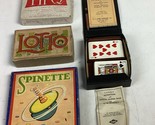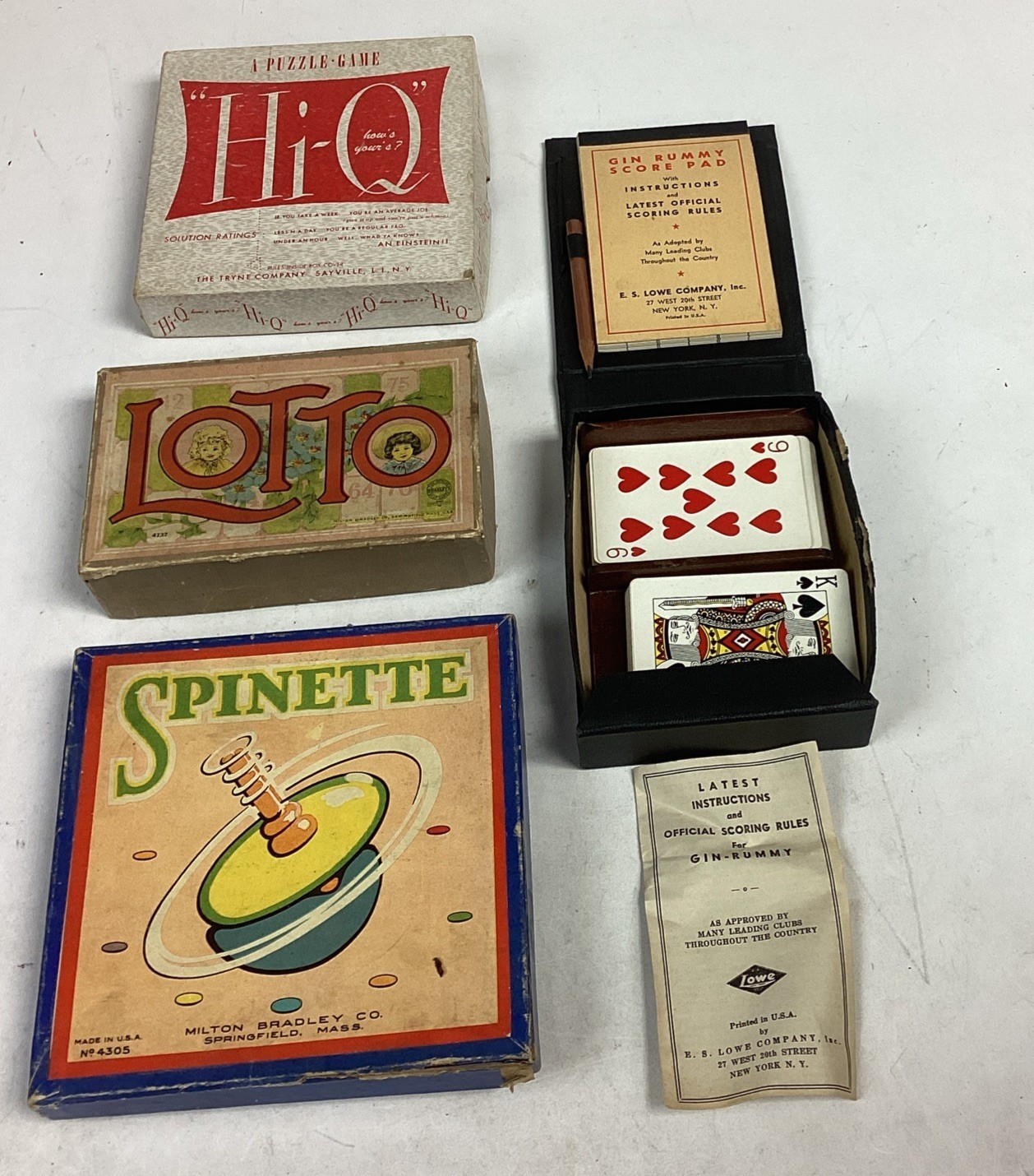Lot Of 4 Vintage Games - Hi-Q, Lotto, Spinette Gin Rummy All games are in used condition and come with everything you see pictured. The lotto game box is starting to fall apart. All other boxes are intact but look worn.