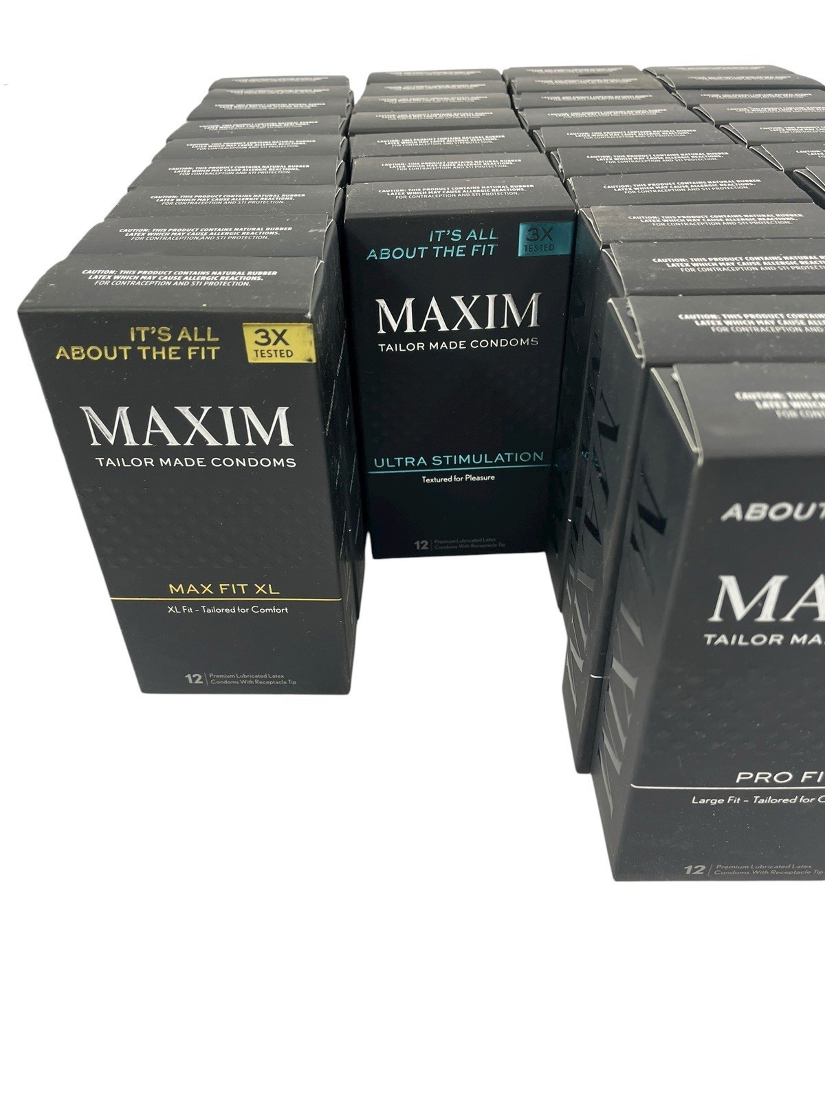 Lot of 561 MAXIM Lubricated Latex Condoms PRO FIT XL ULTRA 3-12C. Boxes EXP 5-26 3 COUNT BOXES : Maxim Ultra sensation x 11 3 COUNT BOXES : Maxim FIt XL x 12 12 COUNT BOXES : Maxim Ultra sensation x 6 12 COUNT BOXES : Maxim Ultra stimulation x 7 12 COUNT BOXES : Maxim Max Fit XL x 9 12 COUNT BOXES : Maxim Perfect fit x 8 12 COUNT BOXES : Pro fit x 11