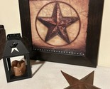 Here is a lot of 3 star decor items and are new but 2 are seconds but does not effect the use of them, their is a new battery operated metal star lantern that takes 3 aaa batteries and batteries are not included just have in it to show you it works , and a 16 inch large rustic star wall print and this is one of the seconds, is new and the frame has a few knicks on it which does not effect it but could touch up with paint if you want, and last items is a rusty tin metal star and it has a small bend on 1 of the points on end which does not effect it and really can not notice it, so you get 3 new items and 2 are seconds so you know, i show close up pictures of the seconds. Still a great buy on the lot