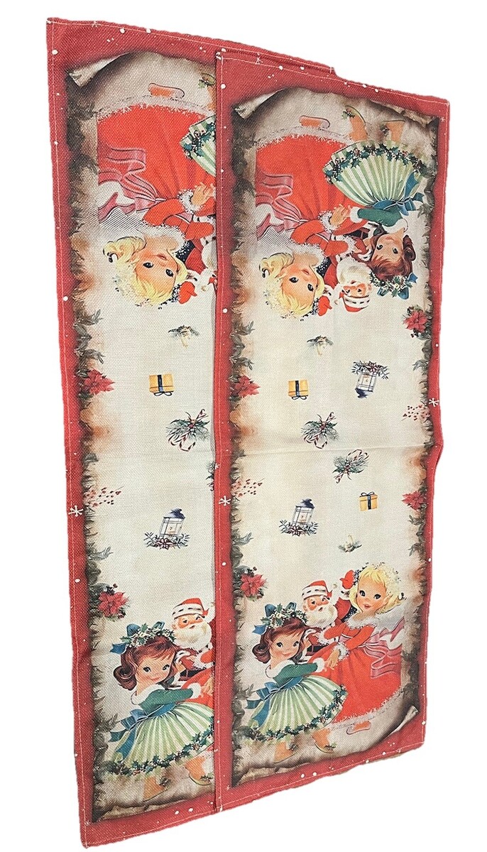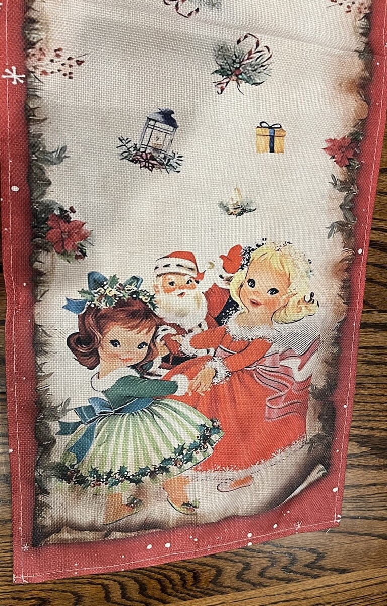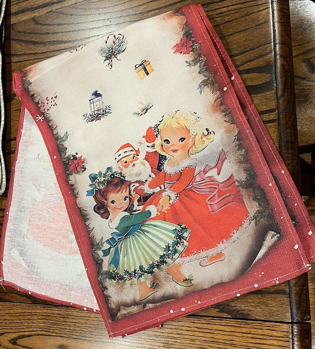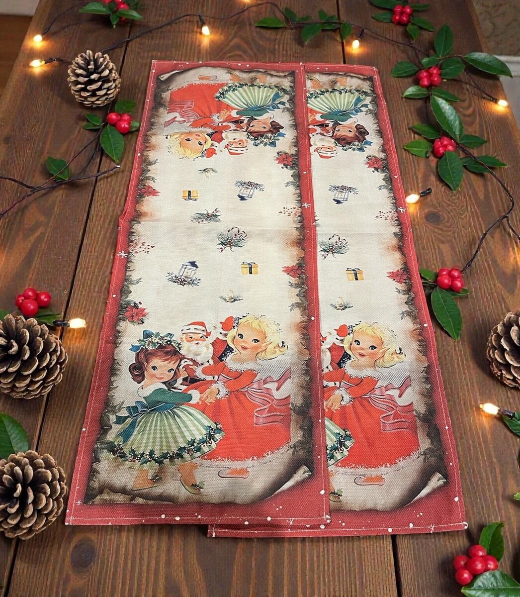 This listing is for a set of two vintage style Christmas table runners featuring a cartoon Santa Claus and girls dancing. Each table runner measures 35.5" in length and 13" in width. Perfect for adding a festive and nostalgic touch to your holiday table setting, these vintage table runners are a charming addition to any Christmas decor collection. Please let me know if you have any questions!