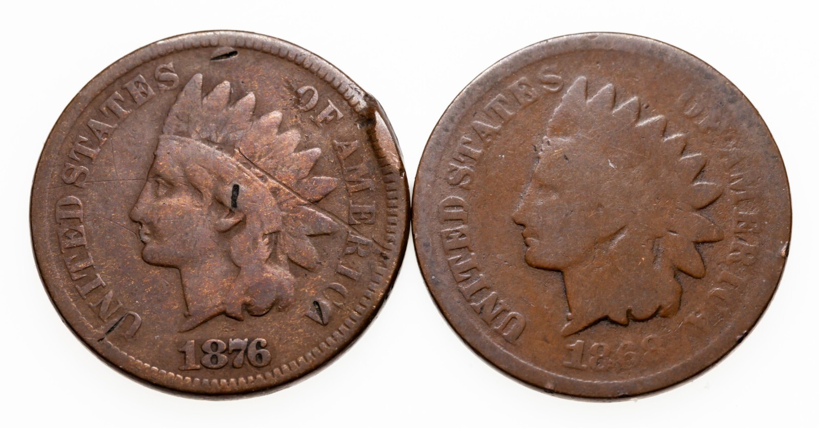 Lot of 2 Indian Cents 1868 + 1876 in About Good Condition, Brown Color