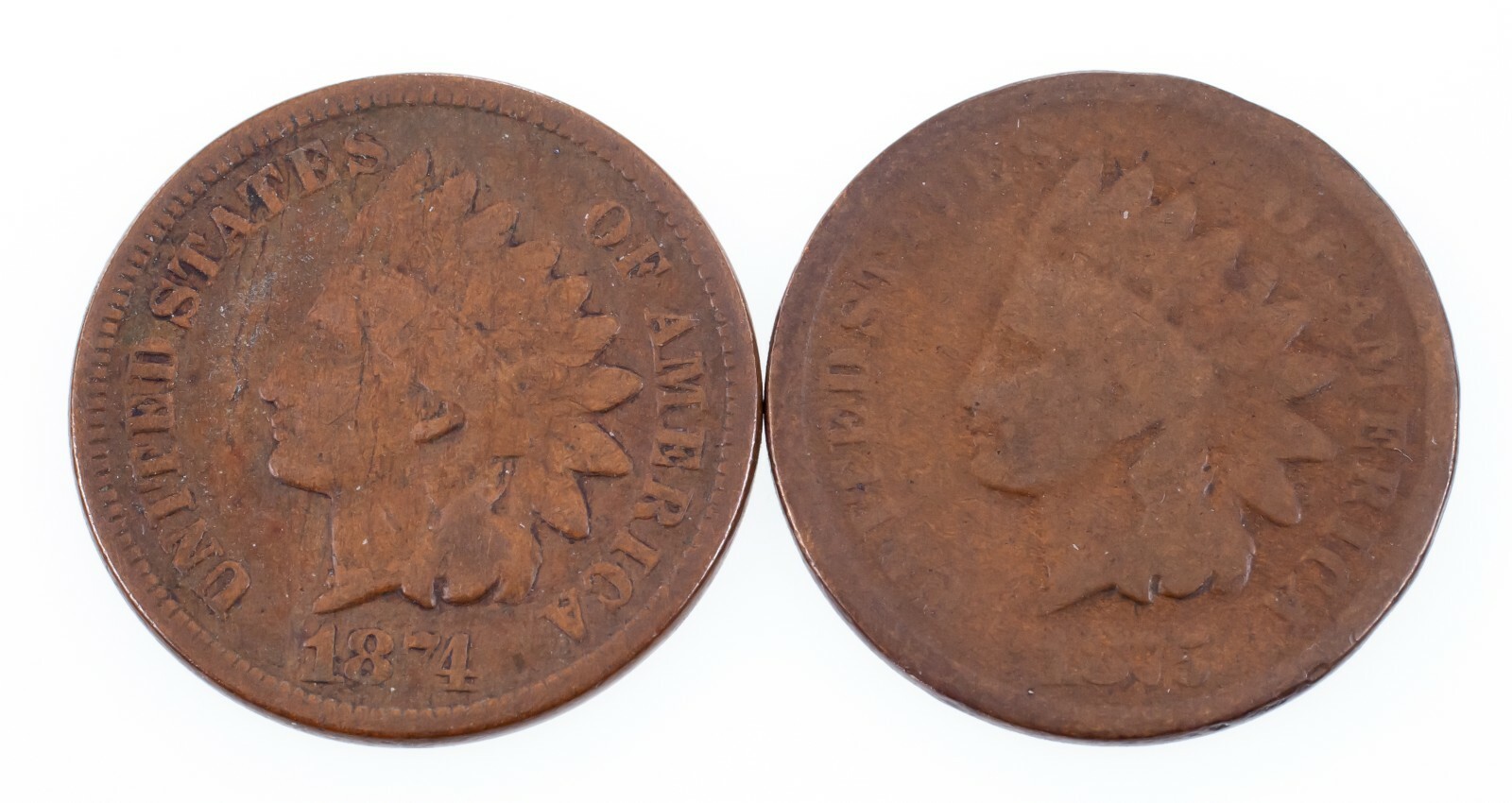 Lot of 2 Indian Cents (1874 VG and 1875 Good), Brown Color for Both
