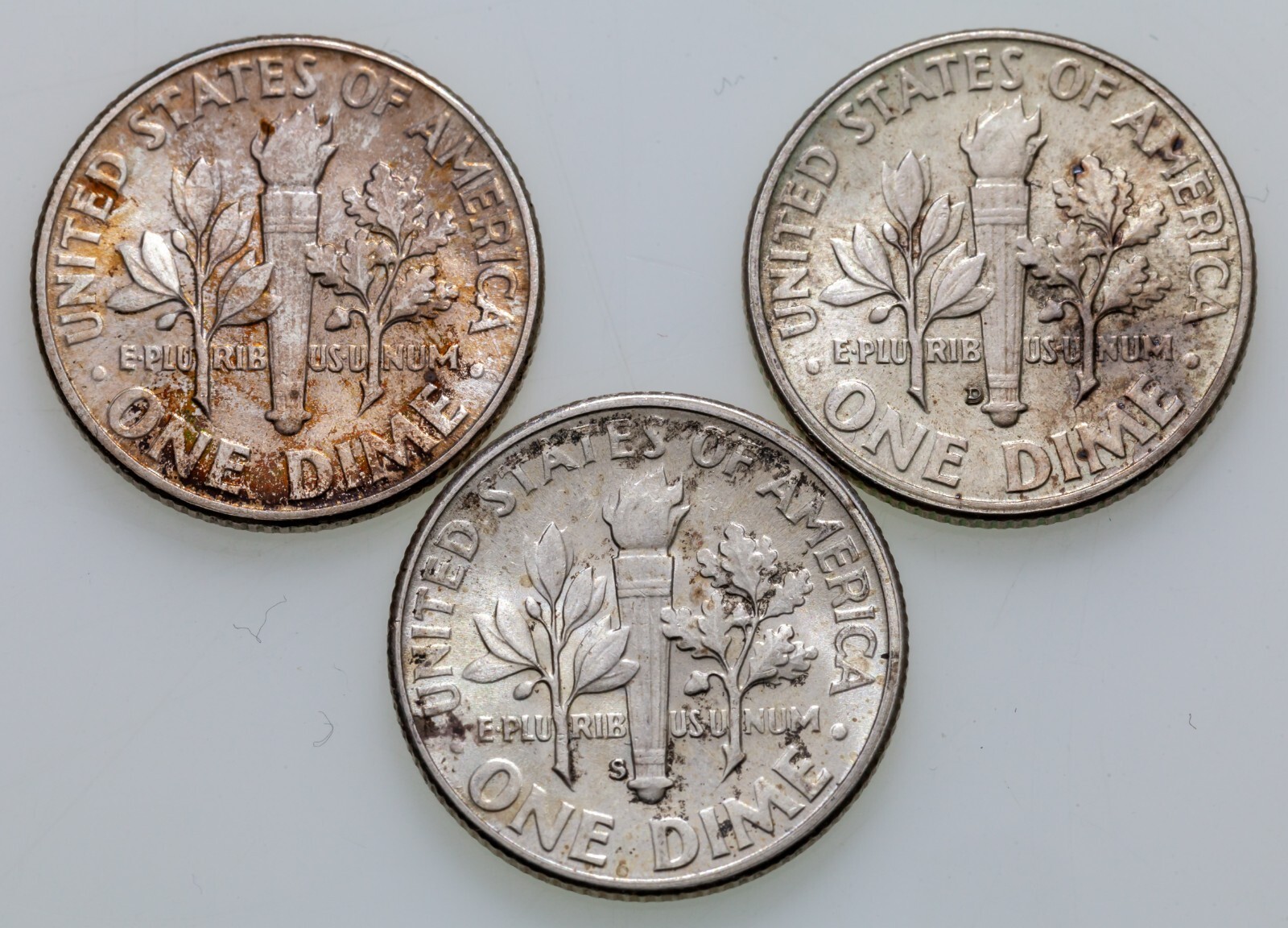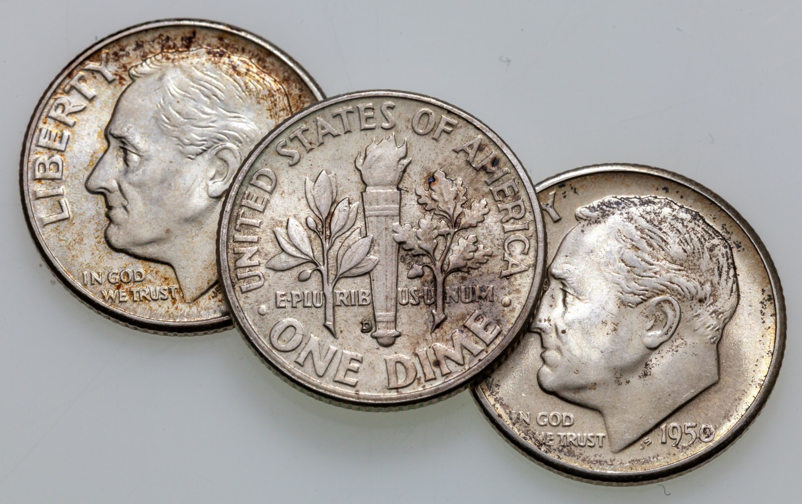 - Lot of 3 Roosevelt Dimes (1950-P,D,S) in Choice BU Condition, Mostly White