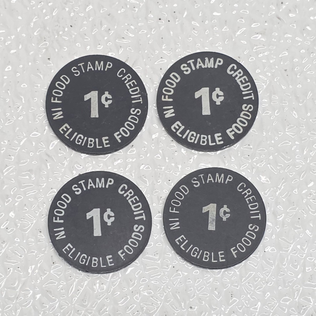 - Lot of 4 Food Stamp Merchant Trade Black Tokens - Crosby Super Duper Grocery