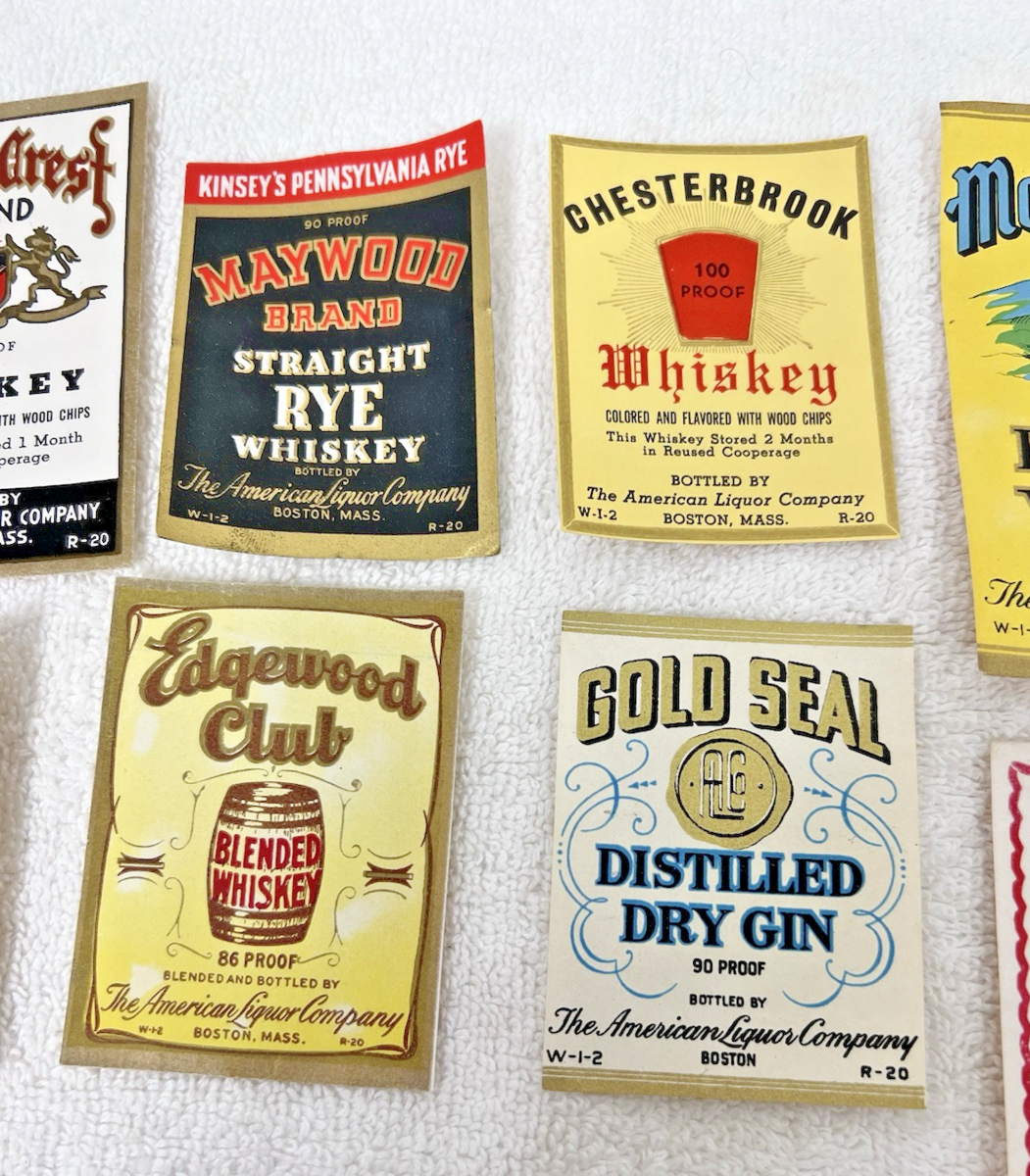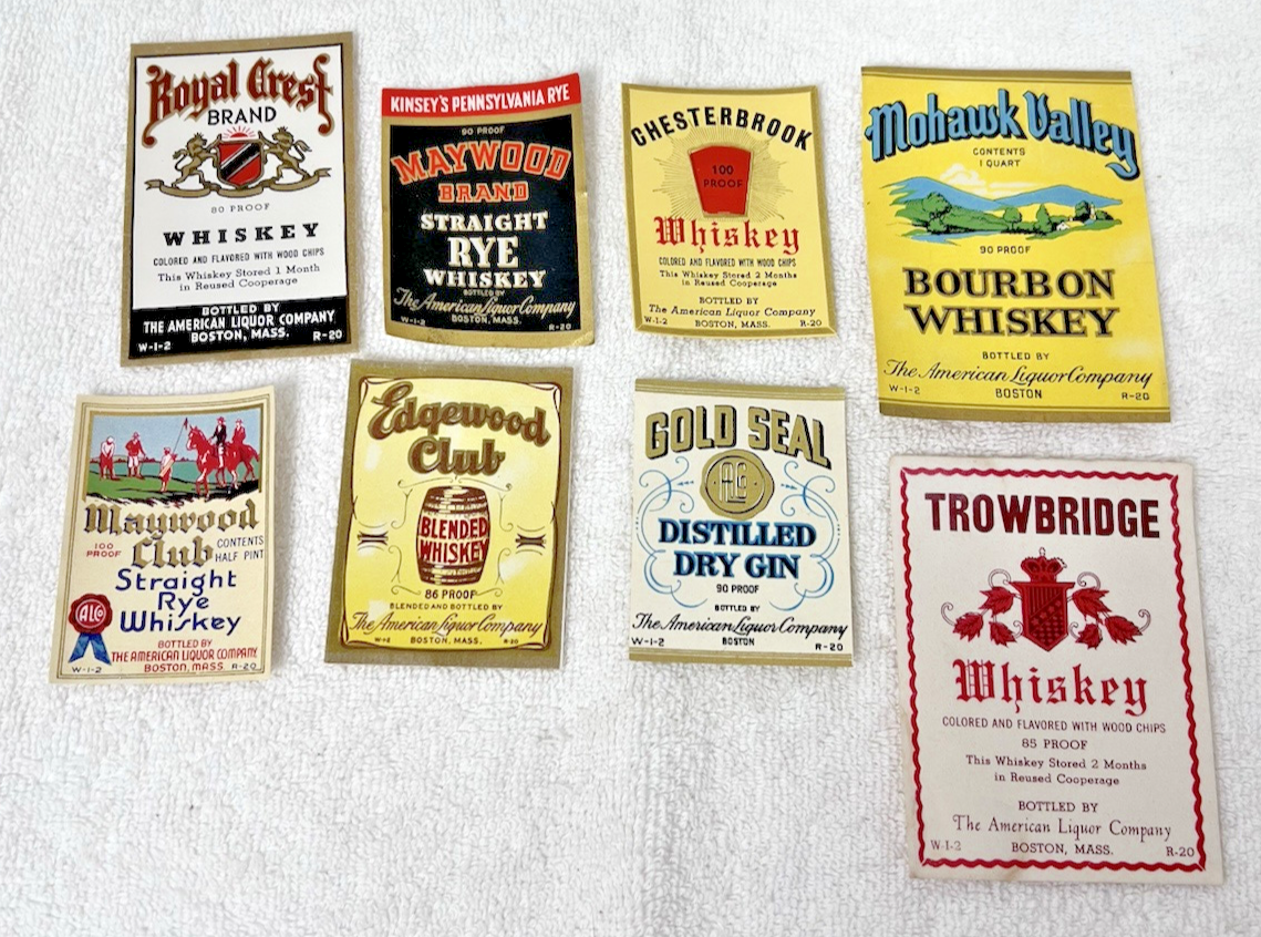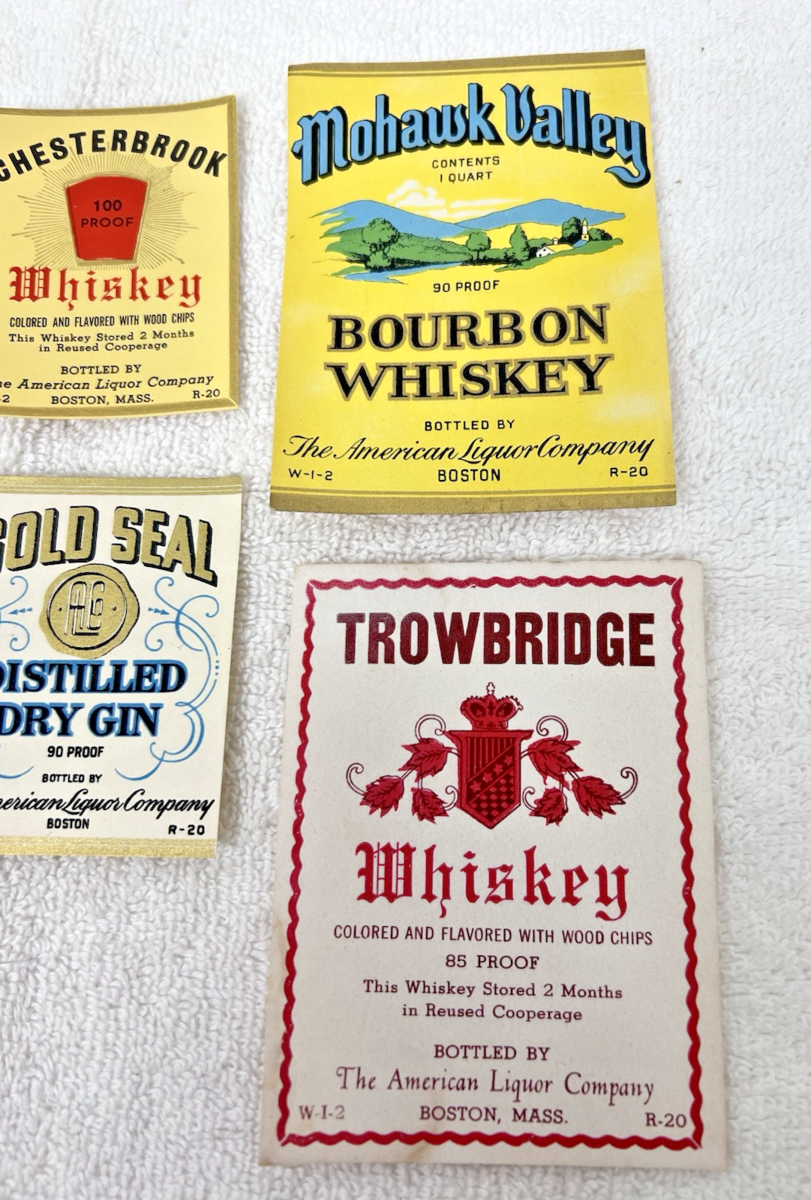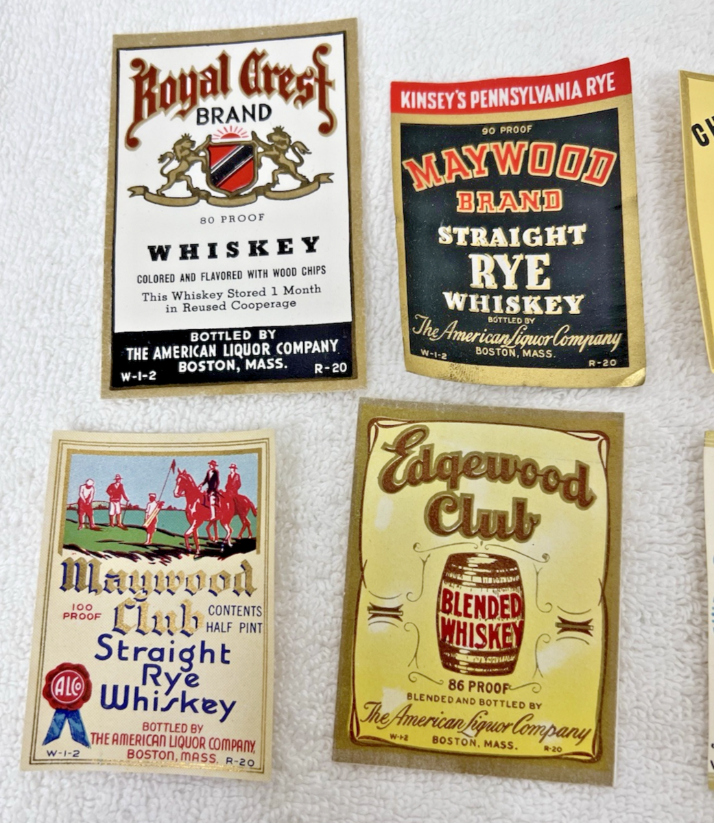 Lot of 8 Antique Whiskey Rye Gin Labels Maywood Club Gold Seal Mohawk Valley