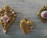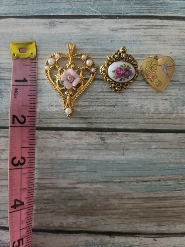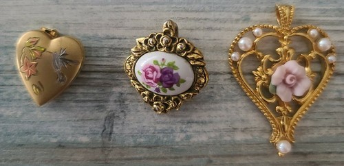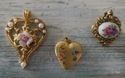 This sale is for three (3) necklace ornament/charm Different materials ~ alloy ~ metal ~ etc... Bought a jewelry box @ an sale these were in it First one is gold-tone with a centered flower pearls Second one is a hummingbird locket Last one is antique finish with a floral design ~ Avon Pieces are in good ~ pre-owned ~ vintage condition Please view photos for a good description of these items Thank you!