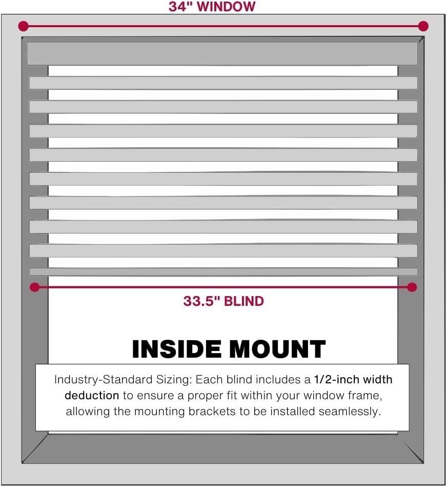 IMPORTANT! - This window blind is 33.5" wide to allow for mounting the blind inside a 34" wide window. Your blind will arrive to you exactly 33.5" wide. Our 2 Inch Faux Wood blinds are designed for a wide variety of window sizes and styles. Sizes stated within the product descriptions are listed by WIDTH then HEIGHT. See measuring instructions to ensure best fit.