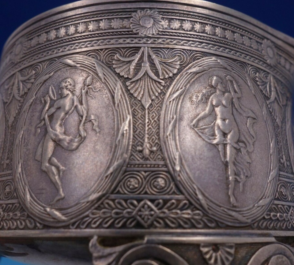 Fabulous Lotus by Whiting Art Nouveau sterling silver sugar and creamer 2-piece set with medallions marked #402. The sugar measures 2 3/4" tall x 6" and weighs 9.6 troy ounces. The creamer measures 3" tall x 4 1/2" and weighs 8.2 troy ounces.