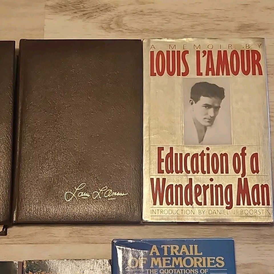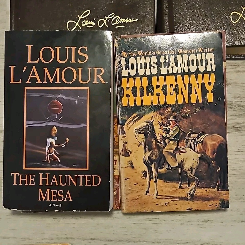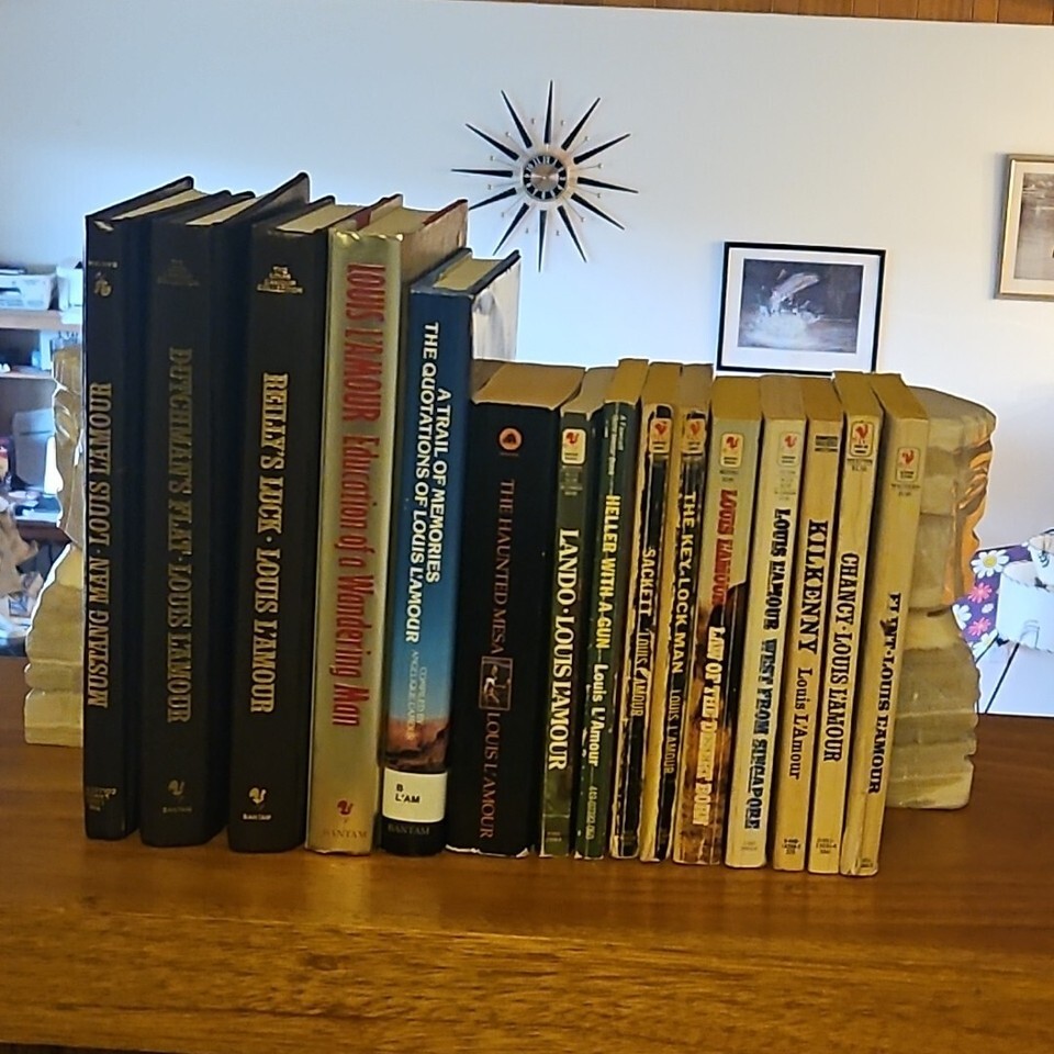Louis L'Amour Mixed Book Lot of Paperbacks, Leatherette and Biographies; Titles as follows: Mustang Man 1983 Leatherette Collection Dutchman's Flat 1987 Leatherette Collection (some binding shift from being under a lot of weight; should relax if stored properly) Reilly's Luck 1981 Leatherette Collection Kilkenny Fawcett Gold Medal Unknown West From Singapore 1987 (small bite of front cover) Law of the Desert Born 1983 The Key Lock Man 1971 (cover creases, initials inside cover) Heller With a Gun 1972 (name on inside cover) The Haunted Mesa 2016 Flint 1980 (wear to cover, notations inside cover) Chancy 1976 Education of a Wandering Man: A Memoir 1989 (with photos) A Trail of Memories: The Quotations of Louis L'Amour 1988 Book Club Edition Sackett 1974 (pencil notations inside cover) The Sacketts Lando 1985 (corner creases)