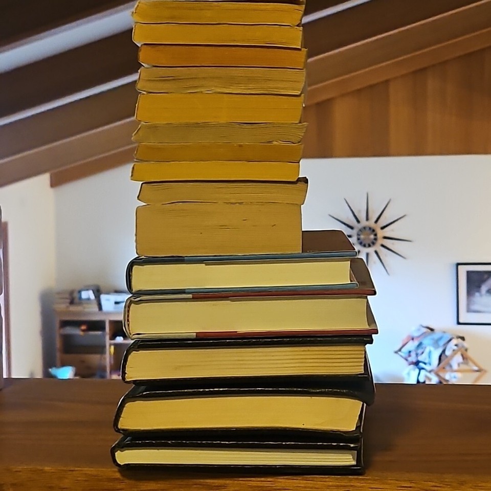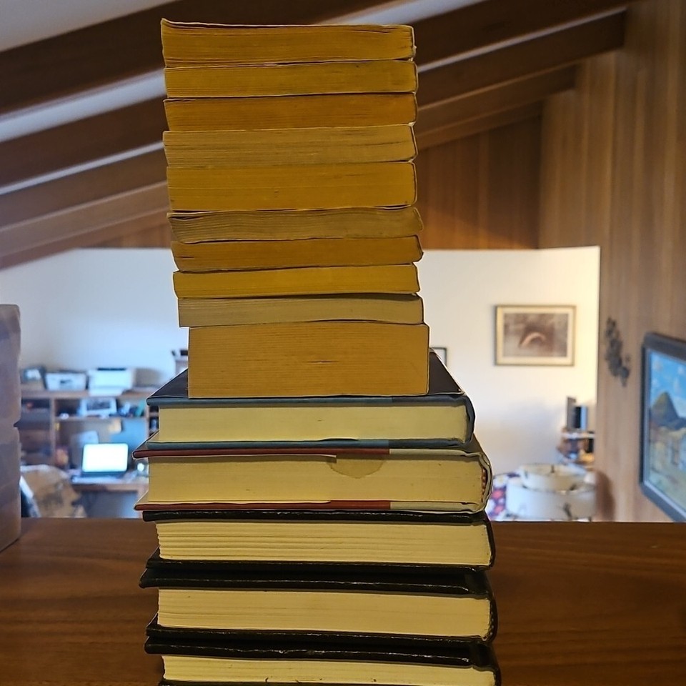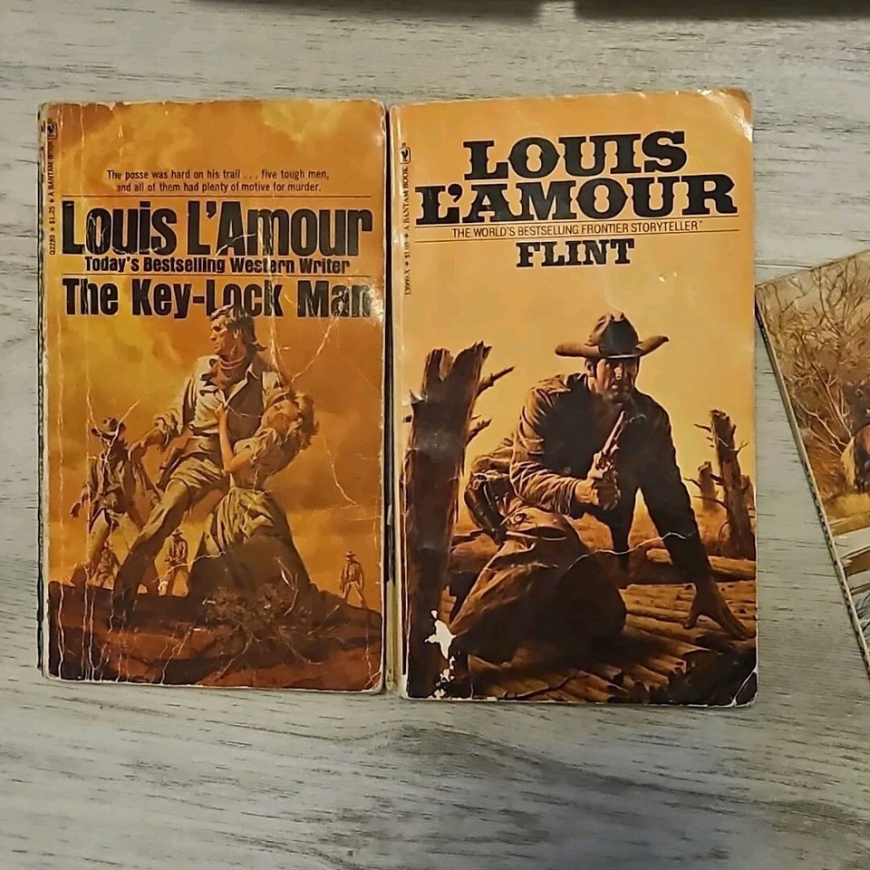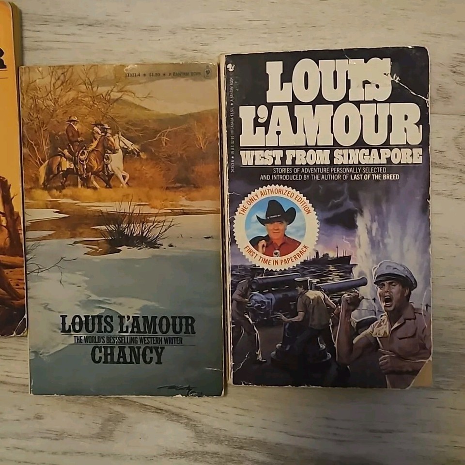 Louis L'Amour Mixed Book Lot of Paperbacks, Leatherette and Biographies; Titles as follows: Mustang Man 1983 Leatherette Collection Dutchman's Flat 1987 Leatherette Collection (some binding shift from being under a lot of weight; should relax if stored properly) Reilly's Luck 1981 Leatherette Collection Kilkenny Fawcett Gold Medal Unknown West From Singapore 1987 (small bite of front cover) Law of the Desert Born 1983 The Key Lock Man 1971 (cover creases, initials inside cover) Heller With a Gun 1972 (name on inside cover) The Haunted Mesa 2016 Flint 1980 (wear to cover, notations inside cover) Chancy 1976 Education of a Wandering Man: A Memoir 1989 (with photos) A Trail of Memories: The Quotations of Louis L'Amour 1988 Book Club Edition Sackett 1974 (pencil notations inside cover) The Sacketts Lando 1985 (corner creases)