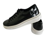These stylish sneakers are crafted of glazed calfskin leather in black and feature the classic LV monogram signature in two tones of grey with a white rubber sole. Lace up. Made in Italy.