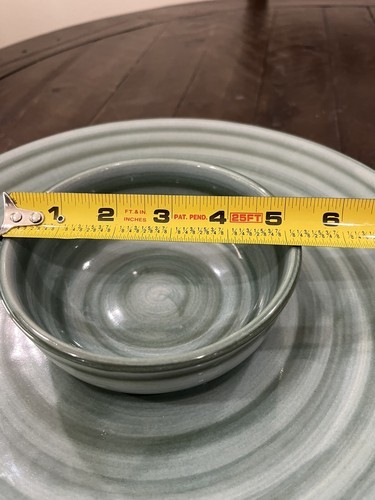 This Louisville Stoneware Pottery Green Circle Swirl Chip n' Dip Tray is a vintage original that adds a touch of art pottery to your collection. The round chip and dip bowl set is made of stoneware material and features a unique green color with a swirl pattern. The set is handmade and produced using pottery techniques in the United States.